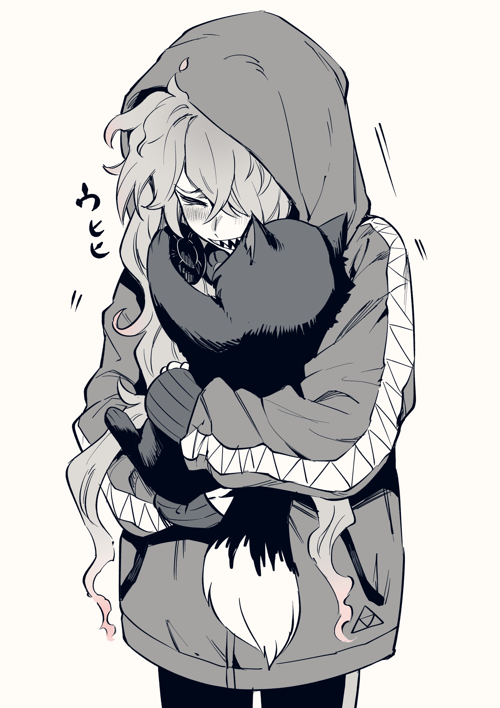 >_< 1boy :d animal animal_hug blush cat closed_eyes dashi_(minzoku_gb) gradient_hair hair_over_one_eye headphones headphones_around_neck highres holding holding_animal holding_cat hood hood_up hoodie idia_shroud long_hair long_sleeves male_focus monochrome multicolored_hair open_mouth pants pink_hair sharp_teeth simple_background smile solo spot_color teeth twisted_wonderland