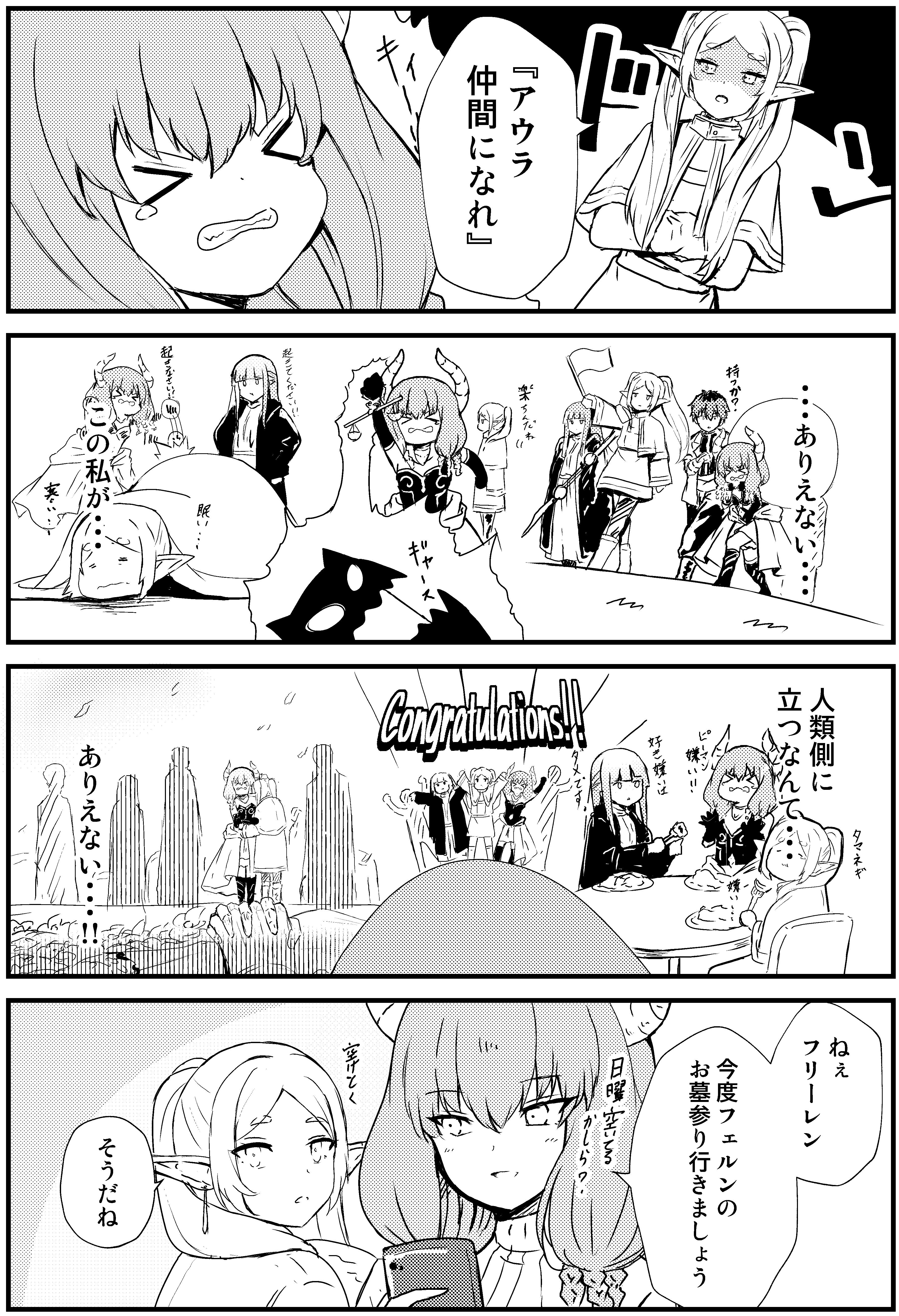 >_< 1boy 3girls 4koma absurdres arm_up aura_(sousou_no_frieren) aura_bullying_(meme) boots braid capelet chair clenched_teeth closed_eyes comic congratulations crossed_arms demon_girl demon_horns dress eating elbow_gloves elf fern_(sousou_no_frieren) flag food fork frieren gloves greyscale handshake highres holding holding_flag holding_fork horns knee_boots long_hair long_sleeves monochrome multiple_braids multiple_girls on_chair open_clothes open_mouth open_robe pantyhose plate pointy_ears ribbed_sweater robe shaded_face shibakame shirt short_eyebrows sitting skirt sousou_no_frieren stark_(sousou_no_frieren) strapless strapless_dress sweater table tears teeth thick_eyebrows translated turtleneck turtleneck_sweater twin_braids twintails very_long_hair waist_cape wavy_mouth