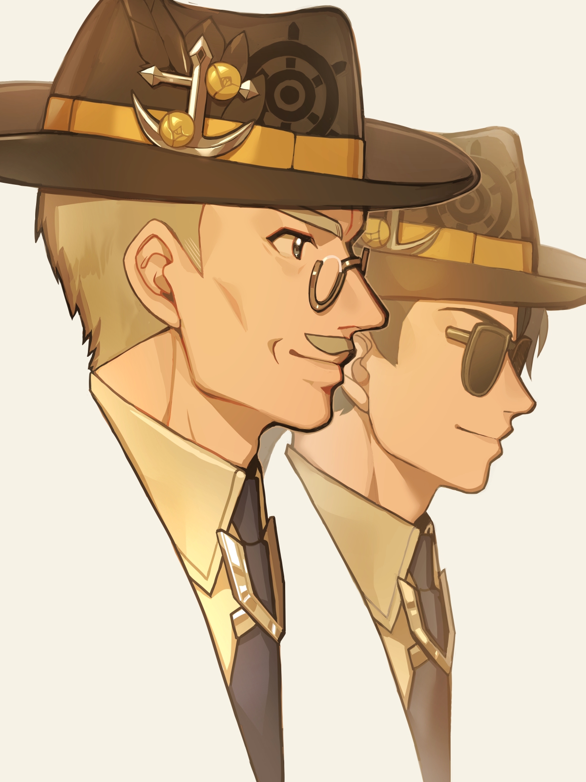2boys black_hair black_necktie brown_headwear closed_mouth collared_shirt cropped_shoulders facial_hair genshin_impact glasses grey_background hat highres light_brown_hair lllkalllwalll male_focus melus_(genshin_impact) multiple_boys mustache necktie profile shirt silver_(genshin_impact) simple_background sunglasses