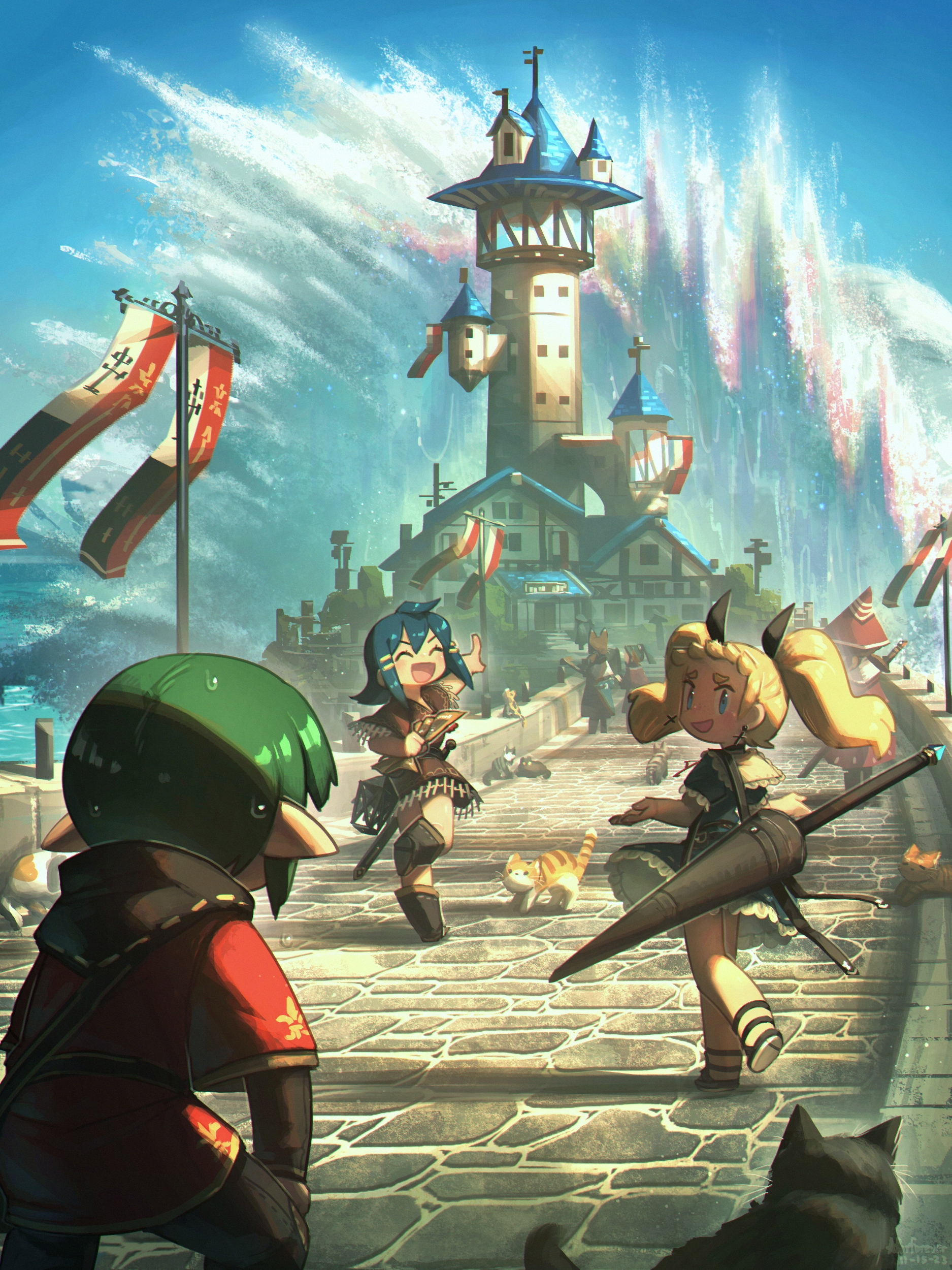 1boy 2girls absurdres animal_ears blonde_hair blue_eyes blue_hair blush boots brown_hair cat closed_eyes cressey_(porforever) cross cross_earrings dated earrings ears_down erynn_(porforever) fantasy flag freckles from_behind green_hair hair_ornament hair_ribbon hairclip happy highres holding holding_map jewelry lance lantern lighthouse long_hair looking_at_another looking_back map multiple_girls ocean open_mouth original outdoors pleated_skirt pointing pointy_ears polearm porforever ribbon scenery shadow short_hair signature skirt sky smile standing standing_on_one_leg sweatdrop sword twintails walking wallace_(porforever) water waves weapon