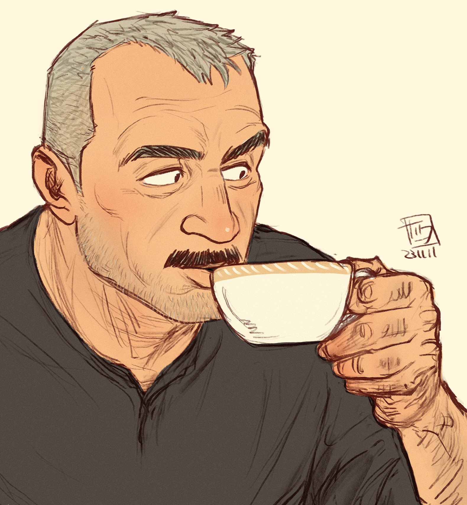 1boy aaron_gruber_(o_natsuo88) bara beard_stubble black_shirt cup drinking facial_hair facial_scar grey_hair highres holding holding_cup looking_to_the_side male_focus mature_male mustache o_natsuo88 old old_man original receding_hairline scar scar_on_cheek scar_on_face shirt short_hair stubble tea thick_eyebrows thick_mustache upper_body wrinkled_skin yellow_background