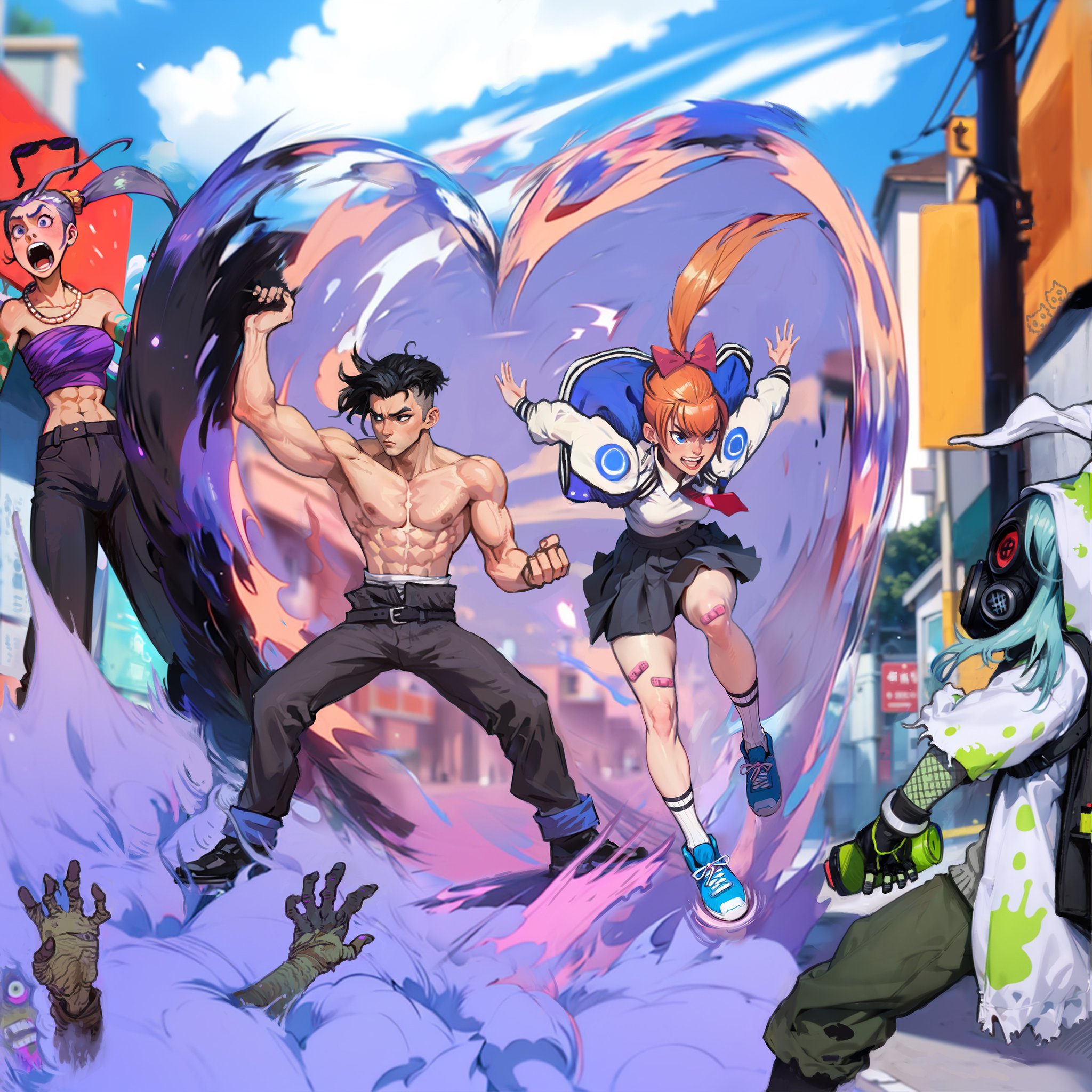 1boy 2girls abs bandaid bare_shoulders black_hair blue_eyes blue_sky bow breasts crop_top emusheret6 heart highres jacket kunio-kun_series kyoko_(kunio-kun) long_hair long_sleeves medium_breasts multiple_girls muscular muscular_male necktie orange_hair pants ponytail punching red_bow riki_(kunio-kun) river_city_girls school_uniform shoes skirt sky sleeveless smoke socks sunglasses topless_male