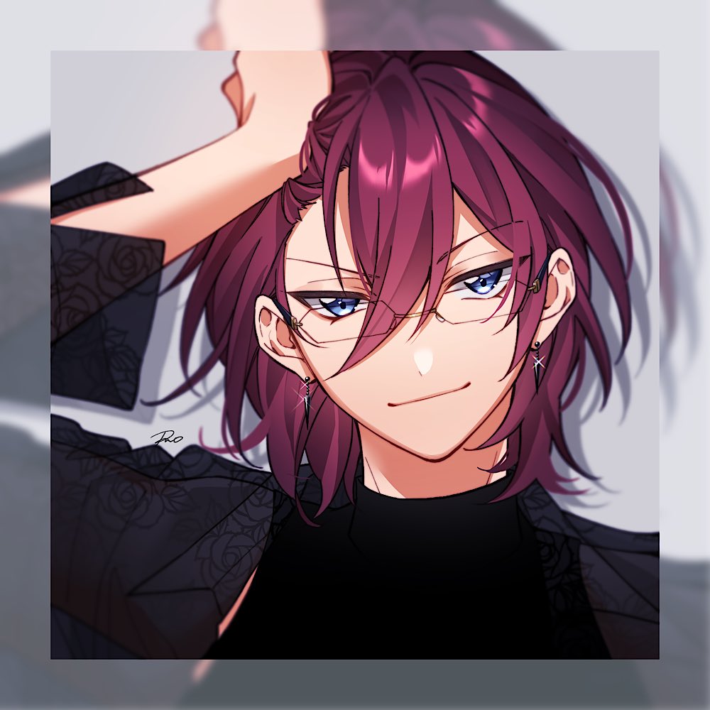 1boy black_shirt blue_eyes blurry_border closed_mouth ensemble_stars! floral_print floral_print_shirt glasses grey_background hand_on_own_head looking_at_viewer male_focus mcopoon purple_hair saegusa_ibara shirt short_hair signature smile solo turtleneck