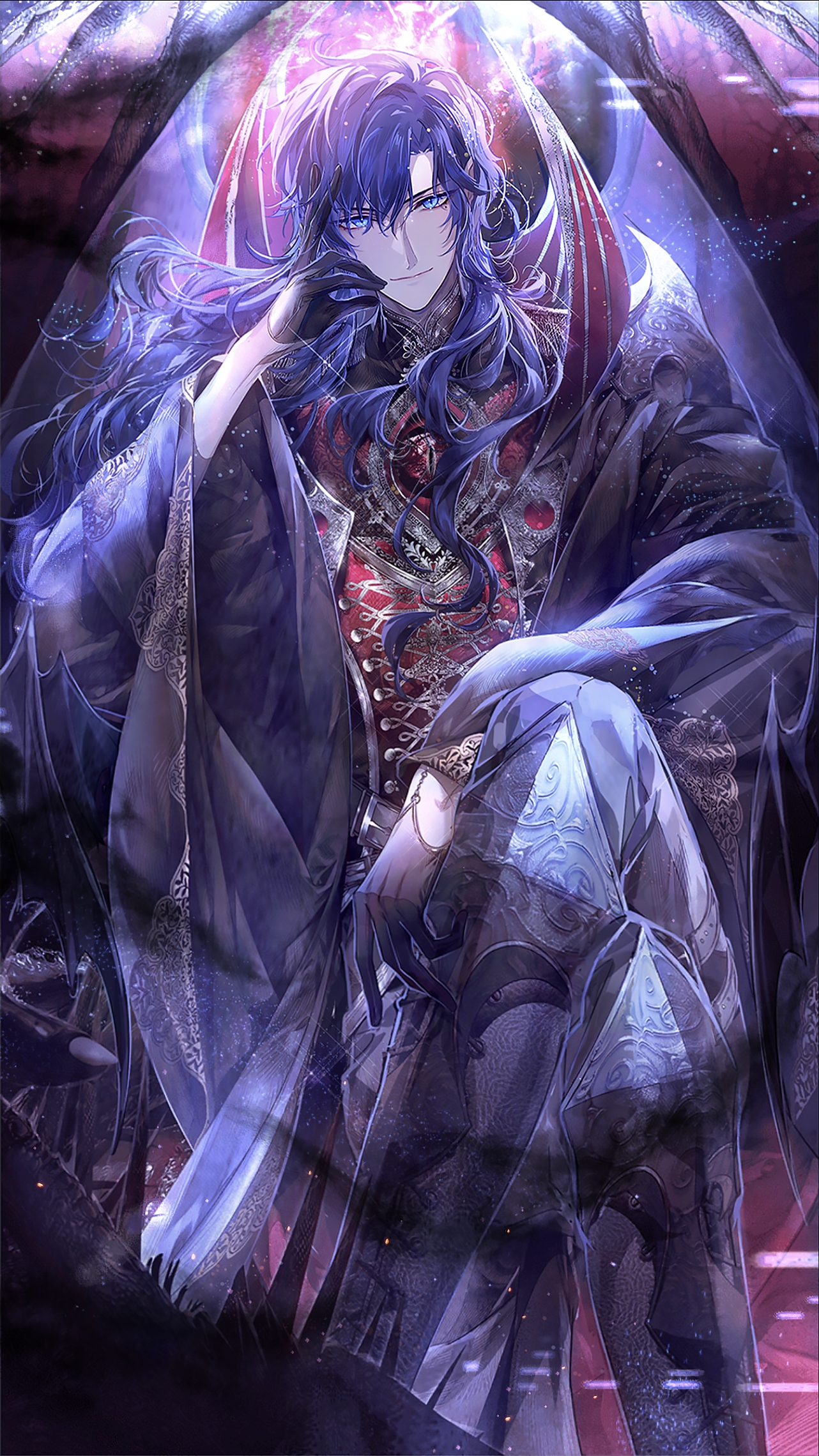 1boy armor armored_boots black_boots black_coat black_gloves black_jacket blue_eyes blue_hair boots brooch clarence_clayden clarence_clayden_(midnight_epilogue) closed_mouth coat crossed_legs demon_boy demon_wings disembodied_eye elbow_rest feet_out_of_frame gem gloves grey_pants hair_between_eyes half_gloves head_rest high_collar highres jacket jewelry long_hair long_sleeves looking_at_viewer lovebrush_chronicles male_focus mole mole_under_eye multicolored_jacket official_art open_clothes open_coat pants pointy_ears red_gem red_jacket red_wings shoulder_armor silver_trim sitting smile solo straight-on swept_bangs two-tone_jacket wavy_hair wide_sleeves wings zhenzhibang149