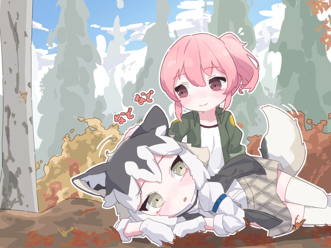 2girls animal_ears eastern_wolf_(kemono_friends) gloves green_jacket grey_hair grey_jacket grey_necktie grey_skirt hand_on_another's_head jacket kemono_friends kemono_friends_3 lying multicolored_hair multiple_girls nana_(kemono_friends) necktie on_side open_clothes open_jacket pink_eyes pink_hair plaid_clothes plaid_necktie plaid_skirt pleated_skirt puffy_sleeves sarutori shirt short_hair side_ponytail skirt tail thighhighs two-tone_hair white_gloves white_hair white_shirt white_thighhighs wolf_ears wolf_girl wolf_tail zettai_ryouiki