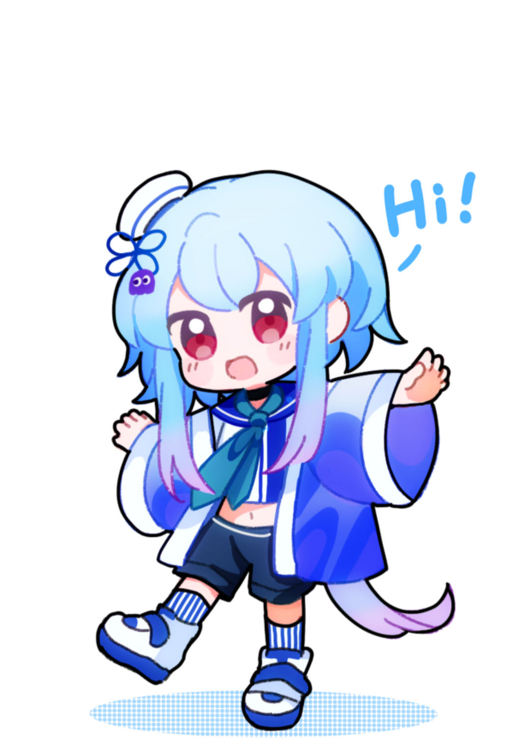 1boy akaruku arknights blue_hair blue_jacket blue_necktie blue_shorts blush chibi chibi_only commentary english_commentary english_text full_body gradient_hair hat highres jacket light_blue_hair long_hair looking_at_viewer male_focus midriff mizuki_(arknights) multicolored_hair necktie open_clothes open_jacket open_mouth ponytail purple_hair red_eyes sailor_hat shadow shirt shoes shorts sidelocks simple_background smile socks solo striped_clothes striped_socks white_background white_hat white_shirt white_shoes