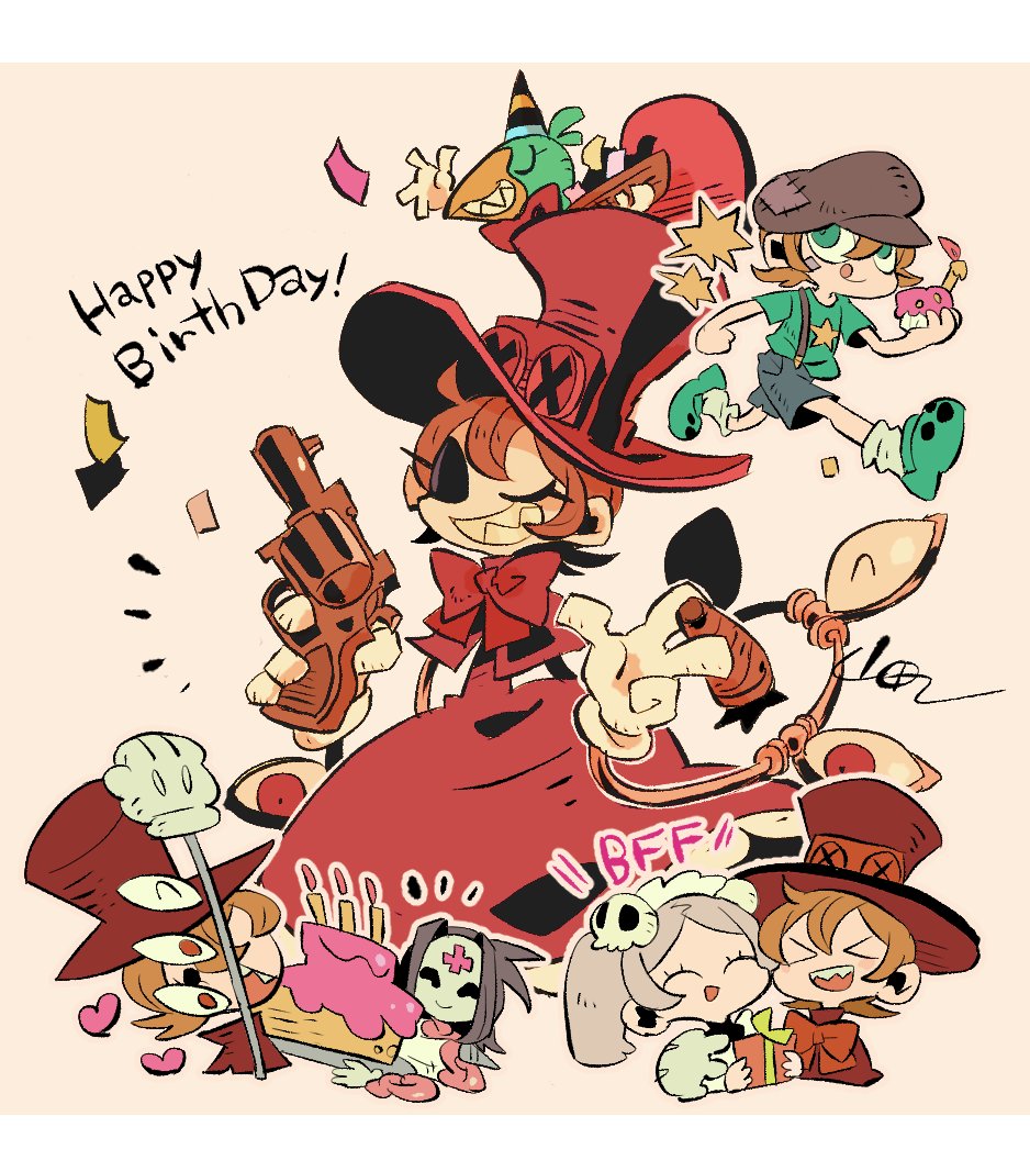 3girls avery_(skullgirls) bandaid bandaid_on_face bird birthday birthday_cake black_hair bloody_marie_(skullgirls) box cake chibi cigar closed_eyes cupcake cyborg english_text food gift gift_box gloves grey_hair grin gun hair_ornament handgun hat heart ileum_(skullgirls) maid_headdress mask multiple_girls multiple_views official_alternate_costume one_eye_closed orange_hair party_hat peacock_(skullgirls) pink_background revolver short_hair skull_hair_ornament skullgirls smile suspenders top_hat twintails weapon yamada9000