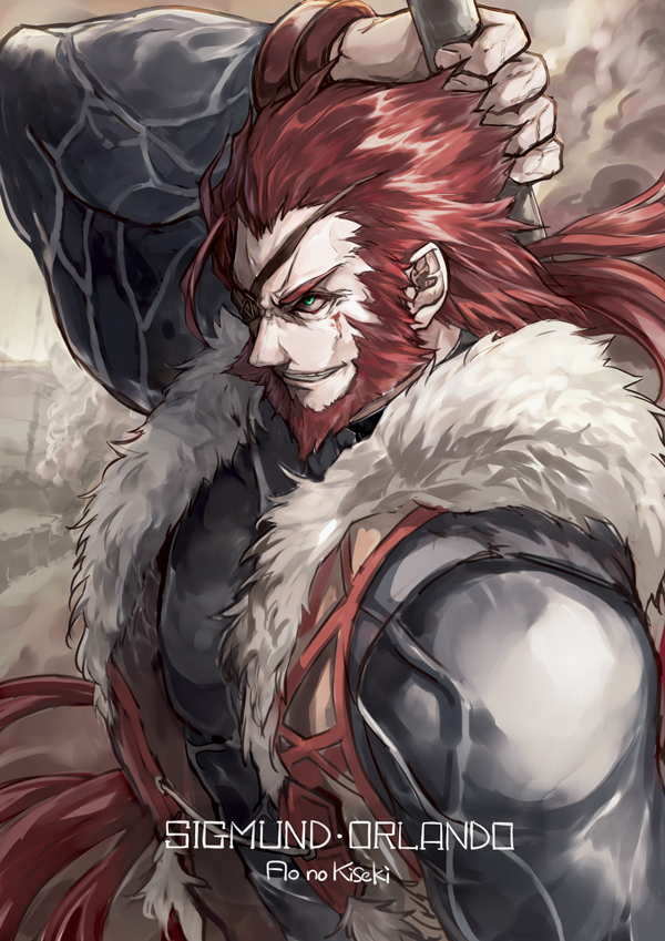 1boy ao_no_kiseki black_jacket blue_eyes character_name copyright_name eiyuu_densetsu facial_hair fur-trimmed_jacket fur_trim holding holding_polearm holding_weapon irise_ryouji jacket male_focus medium_hair muscular muscular_male polearm ponytail red_hair sigmund_orlando smile solo teeth weapon