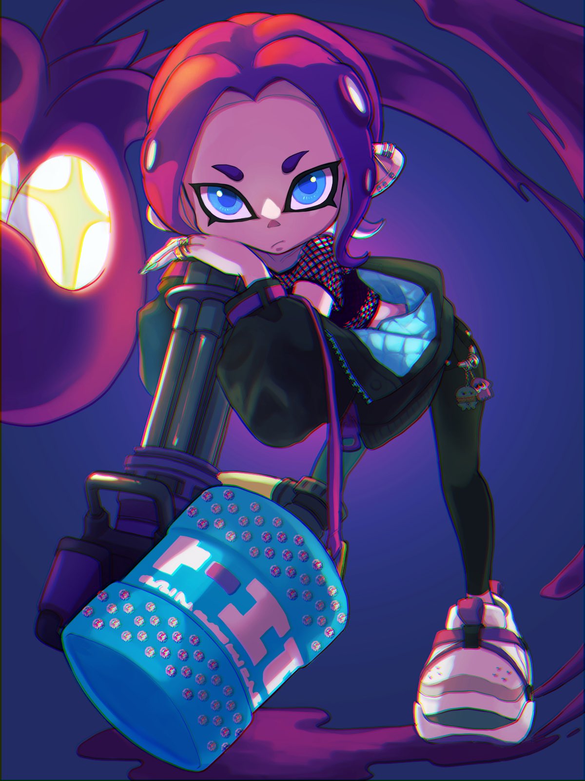 +_+ 1girl black_jacket black_pants blue_eyes commentary_request earrings gradient_background heavy_splatling_(splatoon) highres jacket jewelry kraken_(splatoon) leaning_forward nastar_r0 nintendo octoling octoling_girl octoling_player_character pants purple_background shoes solo splatoon_(series) splatoon_3 tentacle_hair white_shoes