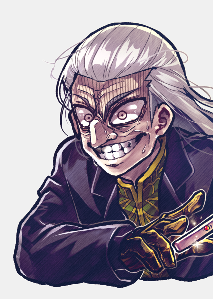 1boy akagi:_yami_ni_oritatta_tensai bags_under_eyes large_nose black_gloves black_jacket brown_eyes commentary_request fukumoto_mahjong gloves gold_trim green_shirt grey_background grin hair_slicked_back jacket katatsumuri_(kataaaaaaaaa) long_hair long_sleeves mahjong male_focus mandarin_collar old old_man shirt simple_background smile solo sweat tenbou upper_body washizu_iwao