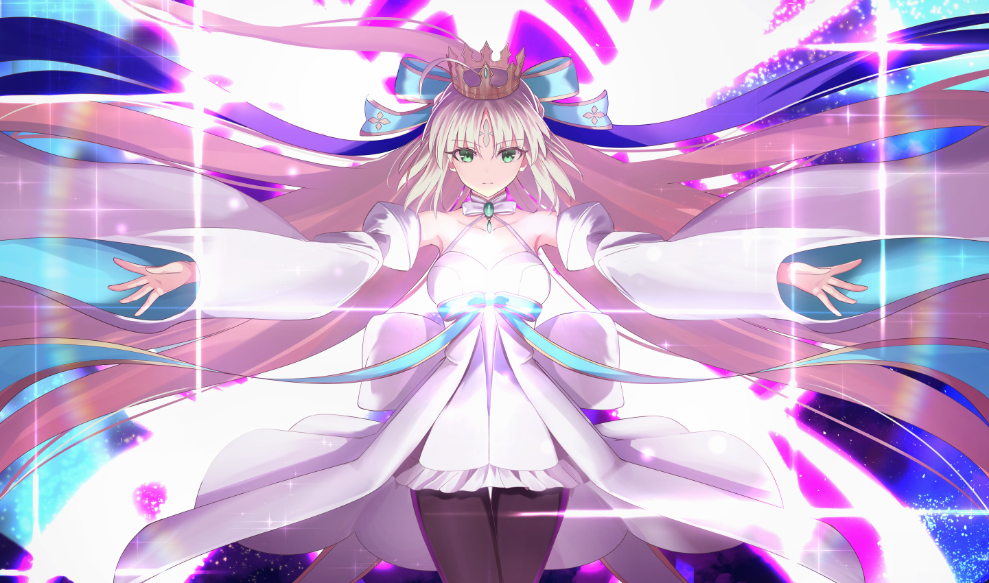 1girl ahoge artoria_caster_(fate) artoria_caster_(hopewill_camelot)_(fate) artoria_caster_(swimsuit)_(fate) artoria_pendragon_(fate) blonde_hair bow bowtie breasts closed_mouth crown detached_sleeves dress facial_mark fate/grand_order fate_(series) forehead_mark green_eyes hair_ribbon leggings long_hair medium_breasts neko_daruma outstretched_arms ribbon white_dress
