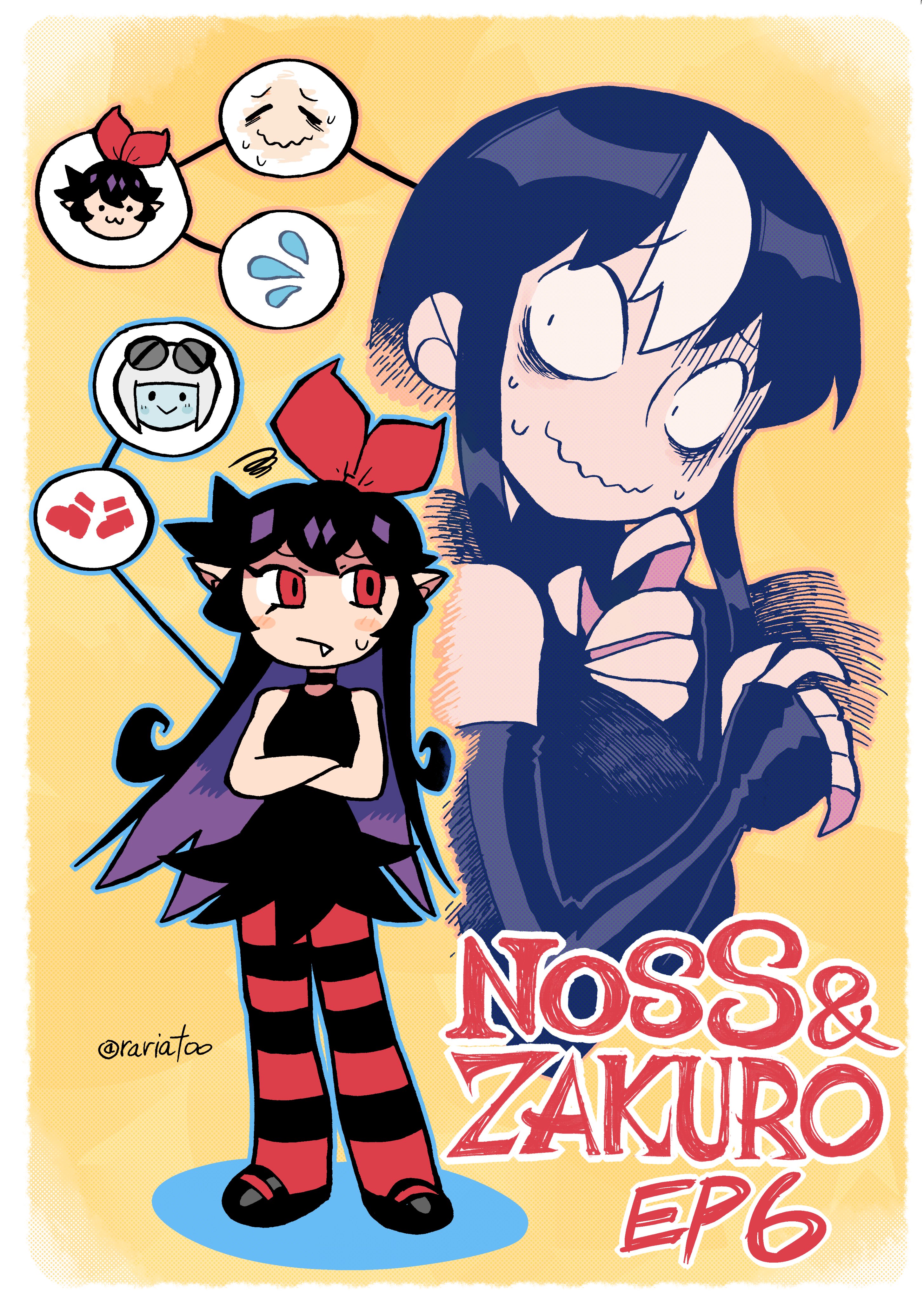 3girls absurdres bags_under_eyes black_dress border bow chapter_number copyright_name detached_sleeves dress elbow_gloves english_text fang flora_(rariatto) gloves hair_bow highres long_hair multicolored_hair multiple_girls nervous_sweating noss_&_zakuro noss_(rariatto) object_through_head rariatto_(ganguri) screw_in_head speech_bubble streaked_hair striped_clothes striped_thighhighs sweat thighhighs twitter_username vampire wavy_mouth white_border white_hair yellow_background zakuro_(rariatto)