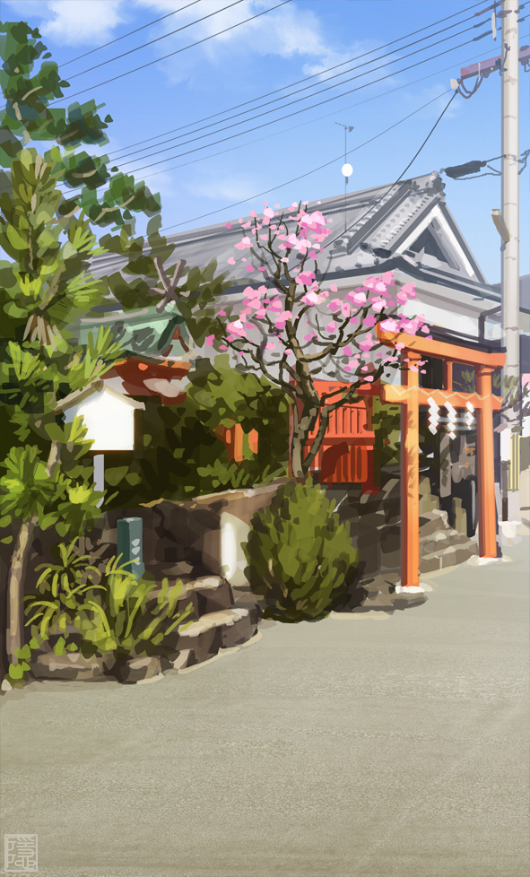 blue_sky building city cloud cloudy_sky day kyoto no_humans original power_lines scenery sky spring_(season) sunlight torii utility_pole yk_funa
