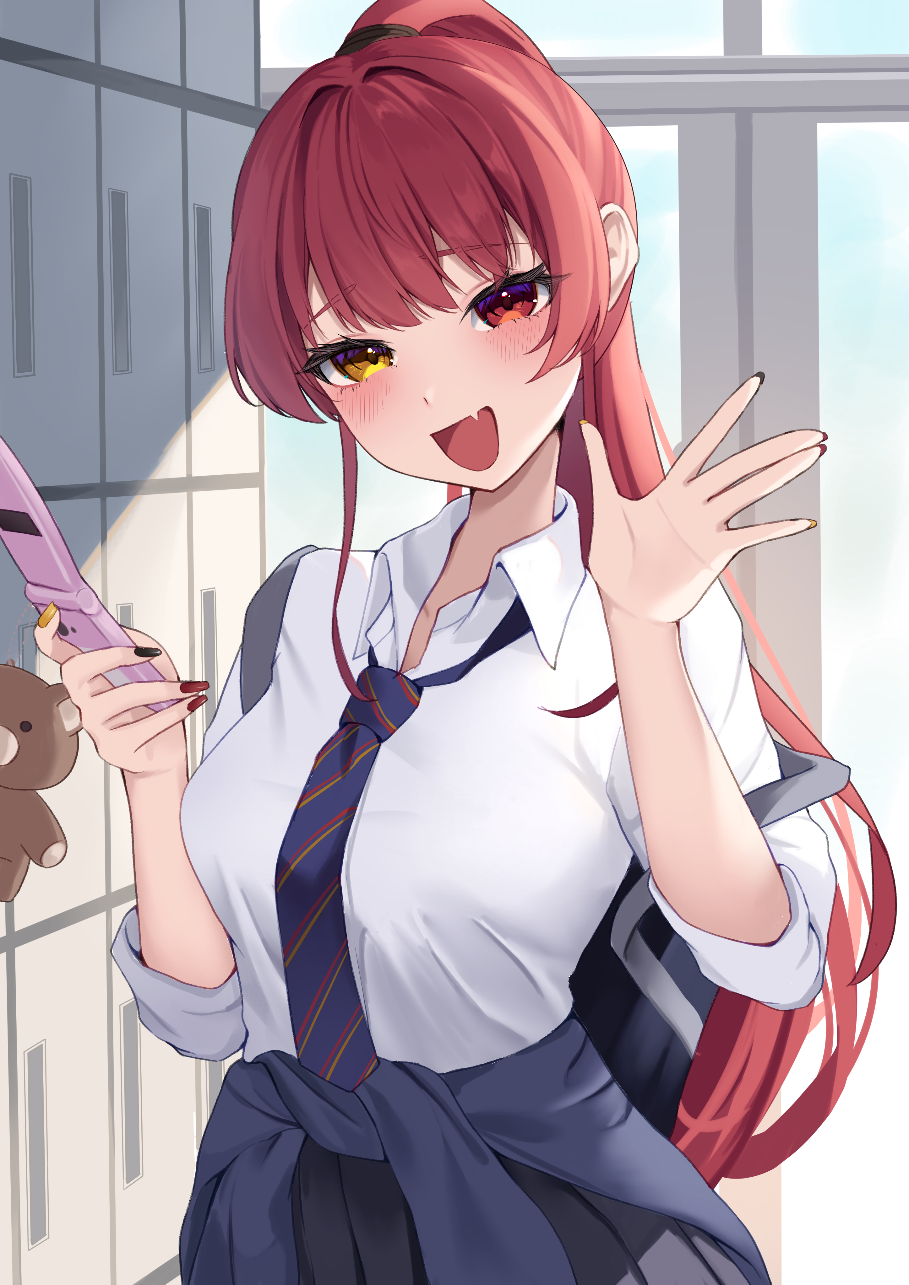 1girl absurdres heterochromia highres hololive houshou_marine looking_at_viewer necktie open_mouth ponytail red_eyes red_hair scarf_(50464982) smile solo virtual_youtuber yellow_eyes