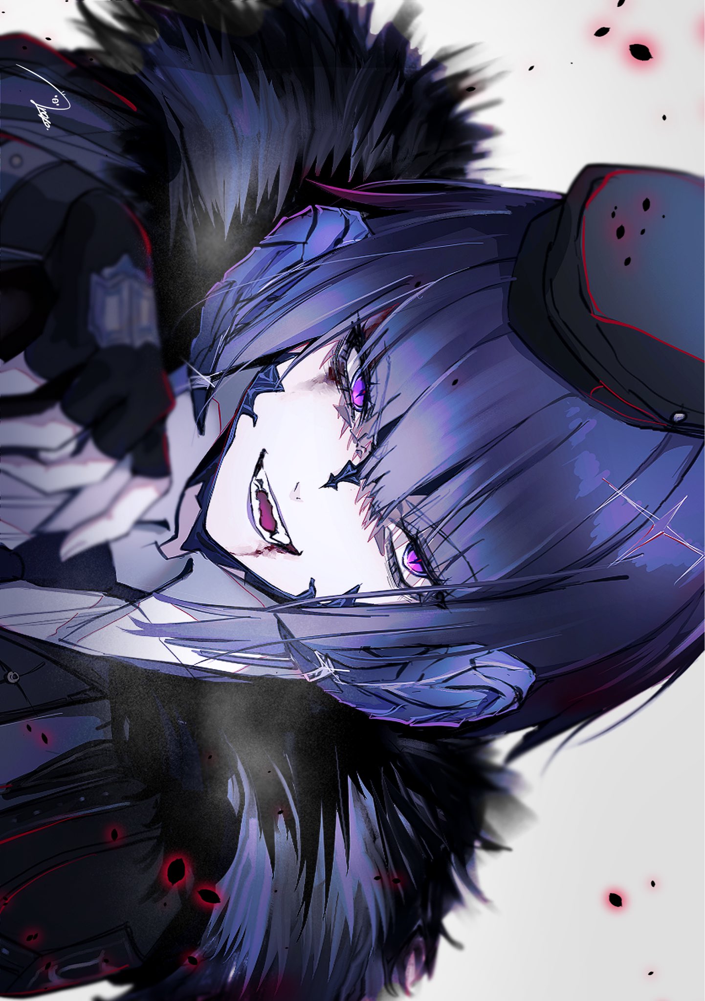 1girl anoyo_(anoyode0) au_ra black_gloves black_headwear blood blood_on_face dragon_horns final_fantasy final_fantasy_xiv fingerless_gloves fur_trim gloves highres horns open_mouth purple_eyes purple_hair purple_horns short_hair sideways solo
