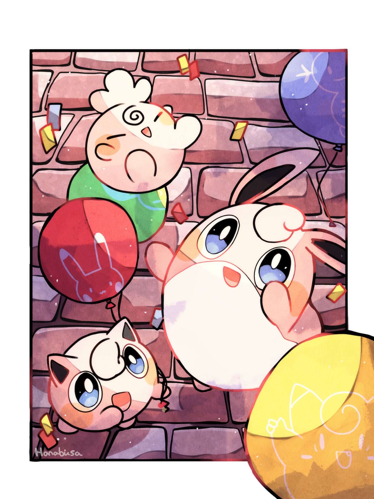 >_< :d animal_focus balloon black_border blue_eyes border brick_road clefairy colored_skin commentary_request confetti evolutionary_line gen_1_pokemon gen_2_pokemon hanabusaoekaki highres holding holding_balloon igglybuff jigglypuff nintendo no_humans open_mouth pikachu pink_skin pokemon pokemon_(creature) smile white_border wigglytuff wooper xd