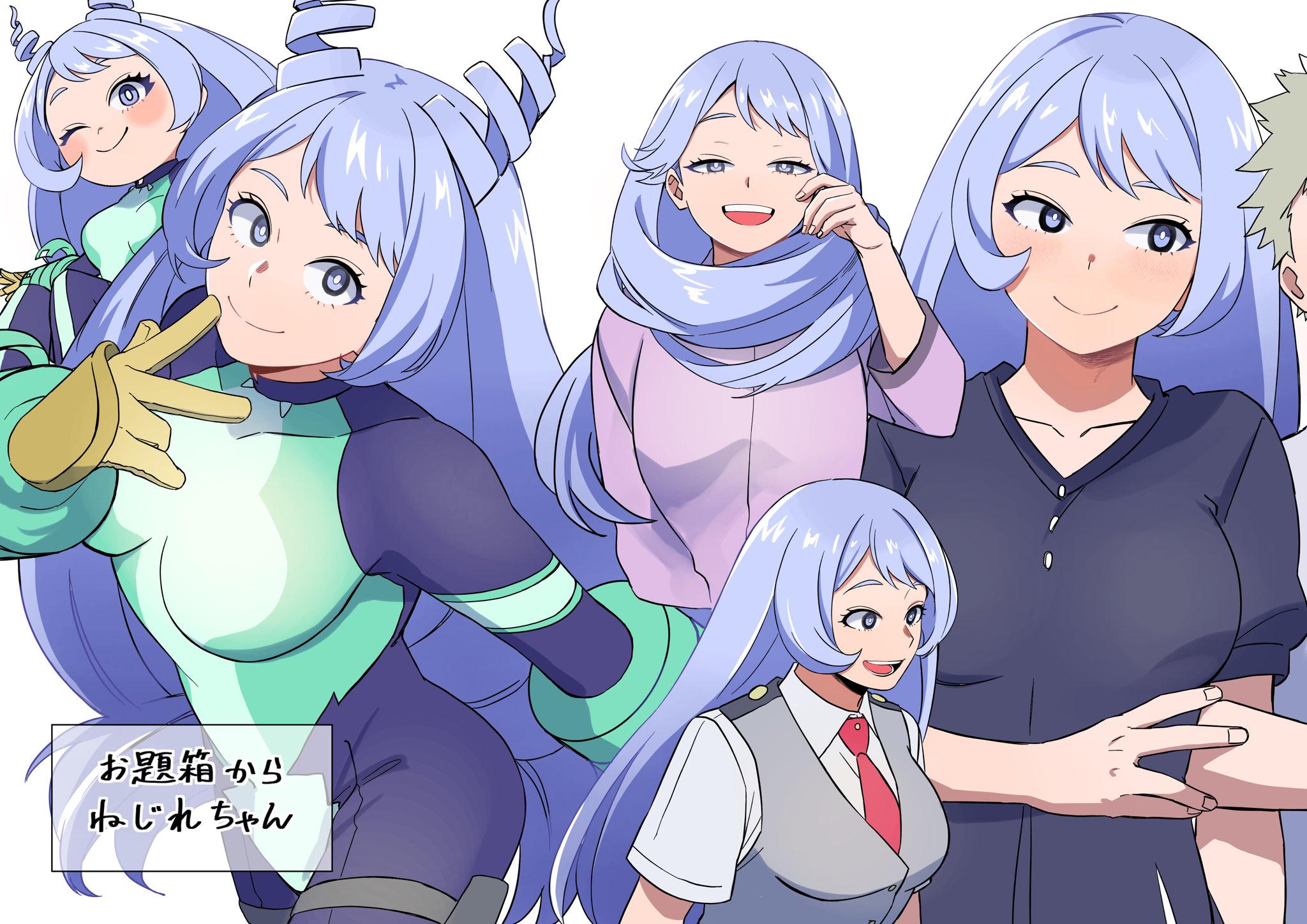 2girls blue_bodysuit blue_hair bodysuit boku_no_hero_academia breasts closed_mouth drill_hair gloves green_bodysuit grey_hair grey_vest hado_nejire hair_horns highres large_breasts light_blue_hair long_hair multicolored_bodysuit multiple_girls multiple_views nishino_(fetv8484) one_eye_closed pajamas purple_pajamas school_uniform short_hair smile solo_focus superhero_costume twin_drills u.a._school_uniform very_short_hair vest yellow_gloves
