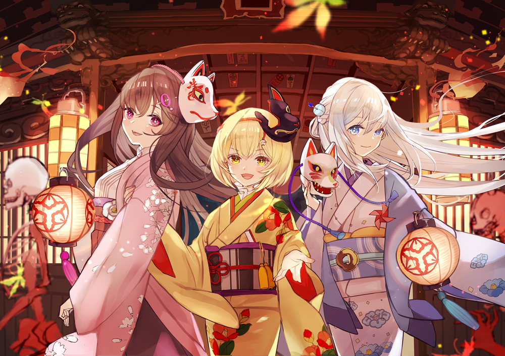 3girls aiha-deko aitsuki_nakuru autumn_leaves blonde_hair blue_eyes blue_kimono brown_hair closed_mouth facing_viewer festival fox_mask hair_ornament holding holding_lantern indie_virtual_youtuber japanese_clothes kimono la_priere lantern leaf long_hair mask multiple_girls natsume_itsuki_(voice_actor) nayuta_(voice_actor) open_mouth outstretched_hand paper_lantern pink_eyes pink_kimono pinwheel reaching short_hair shrine skeleton smile white_hair yellow_eyes yellow_kimono