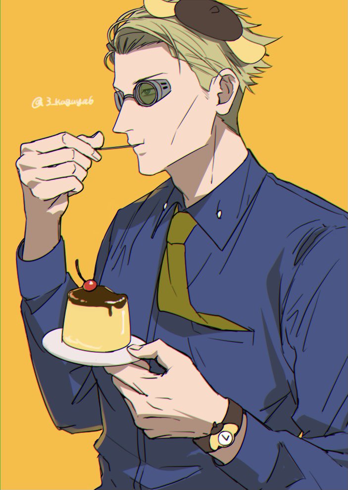 1boy animal_ears beret blonde_hair blue_shirt character_hat collared_shirt dog_ears eating food goggles hat holding holding_plate jujutsu_kaisen long_sleeves male_focus nanami_kento necktie necktie_in_pocket plate pompompurin pudding sano_maru sanrio shirt short_hair solo upper_body watch wristwatch yellow_necktie