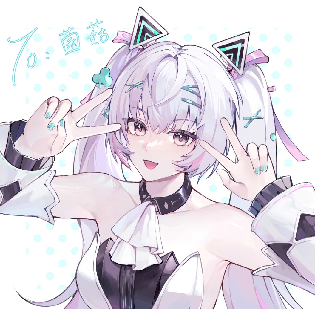 1girl armpit_peek ascot bare_shoulders black_collar black_dress chinese_commentary collar collarbone commentary detached_sleeves dress eyeshadow gift_art hair_between_eyes hair_intakes hair_ornament hair_ribbon hairclip idol karenina:_scire_(neon_dynamite)_(pgr) karenina:_scire_(pgr) karenina_(pgr) karin_(2290463757) layered_sleeves long_hair looking_at_viewer makeup multicolored_hair official_alternate_costume pink_eyes pink_eyeshadow pink_ribbon polka_dot polka_dot_background portrait punishing:_gray_raven ribbon smile solo strapless strapless_dress streaked_hair triangle_hair_ornament twintails two-tone_dress v white_ascot white_dress white_hair white_sleeves x_hair_ornament