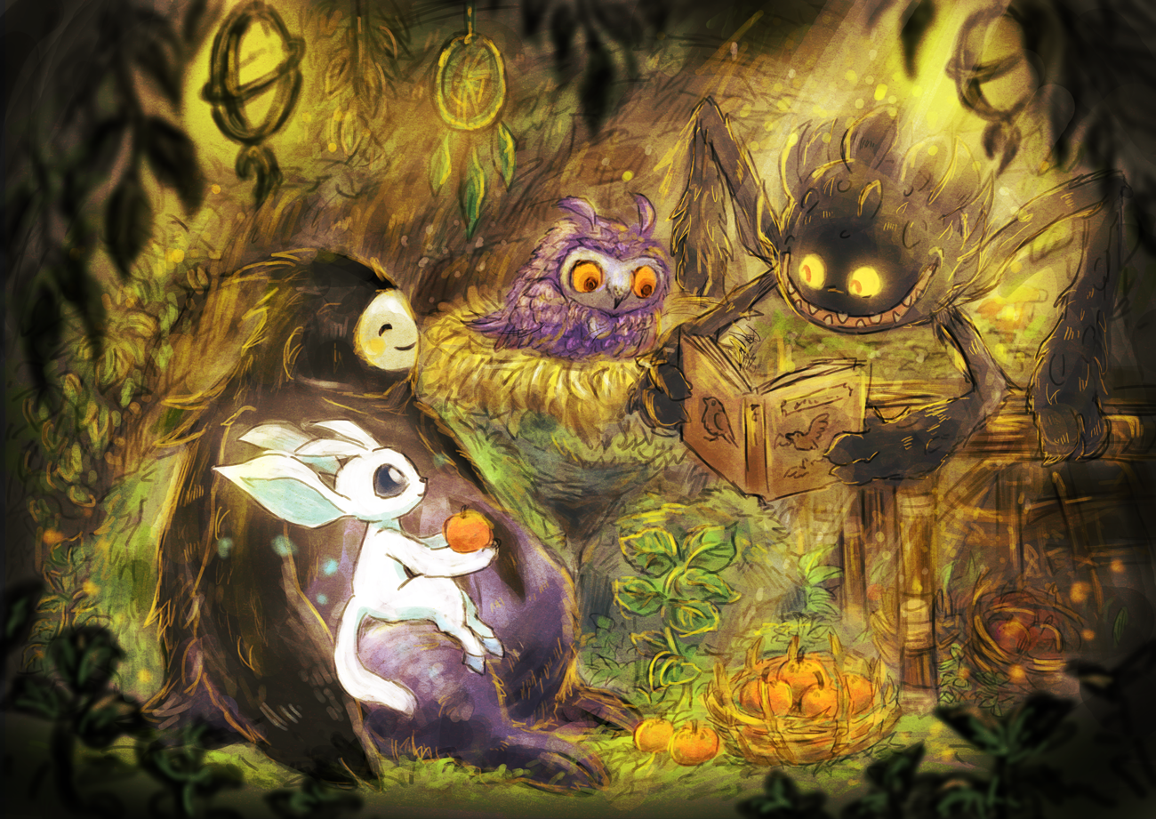 basket bird book dreamcatcher ei_(stingray) food fruit gourd gumo_(ori_and_the_blind_forest) ku_(ori_and_the_blind_forest) naru_(ori_and_the_blind_forest) nest open_book open_mouth ori_(ori_and_the_blind_forest) ori_and_the_blind_forest owl plant reading sitting sunlight