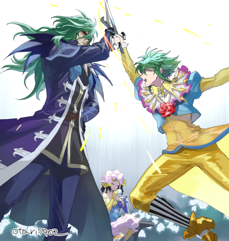 1boy 2girls asellus_(saga_frontier) cape closed_mouth dress flower gloves green_hair ildon indesign long_hair multiple_girls open_mouth princess_white_rose red_flower red_rose rose saga saga_frontier short_hair sword weapon