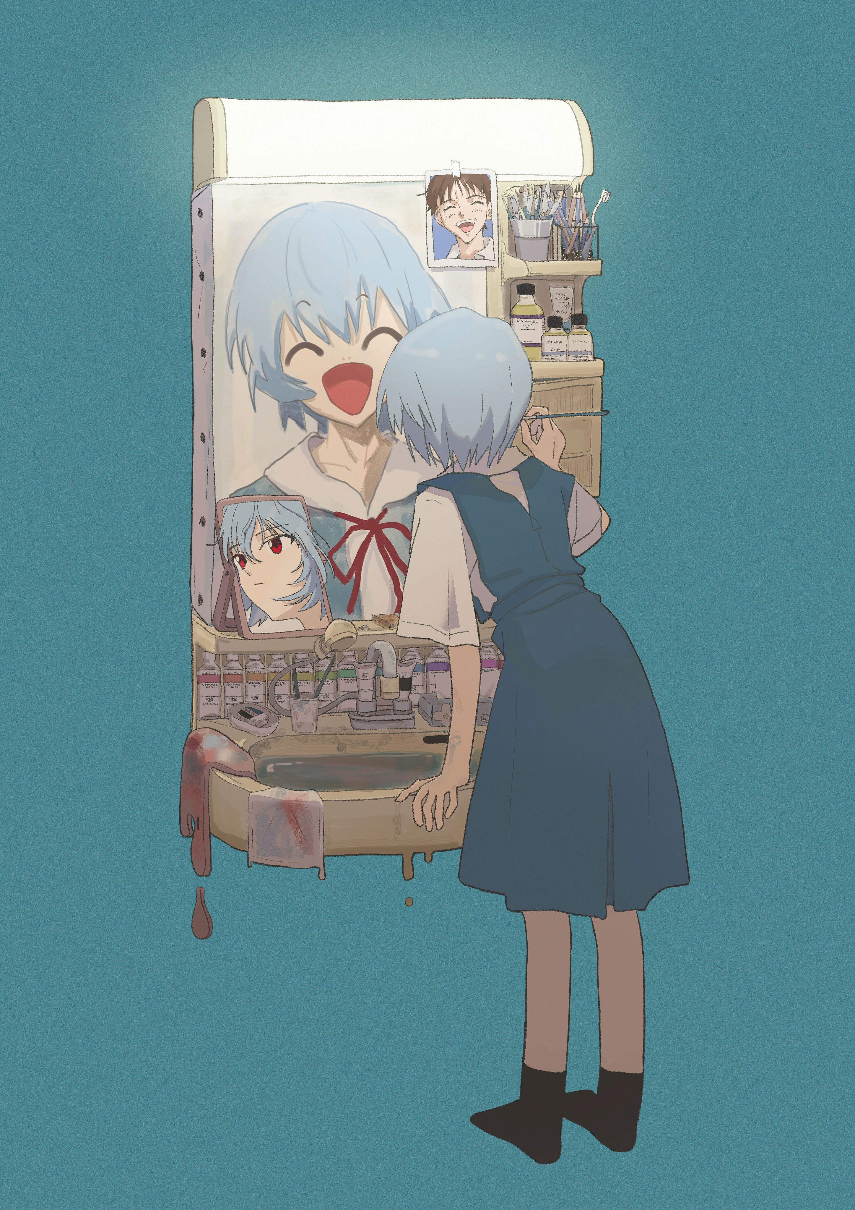 1girl ^_^ absurdres ayanami_rei black_socks blue_dress blue_hair canvas_(object) closed_eyes commentary dorarin drawing_(action) drawing_(object) dress facing_away from_behind full_body green_background highres holding holding_brush ikari_shinji mirror neck_ribbon neon_genesis_evangelion no_shoes paint photo_(object) reflection ribbon school_uniform shirt short_hair short_sleeves simple_background sink socks solo tokyo-3_middle_school_uniform white_shirt