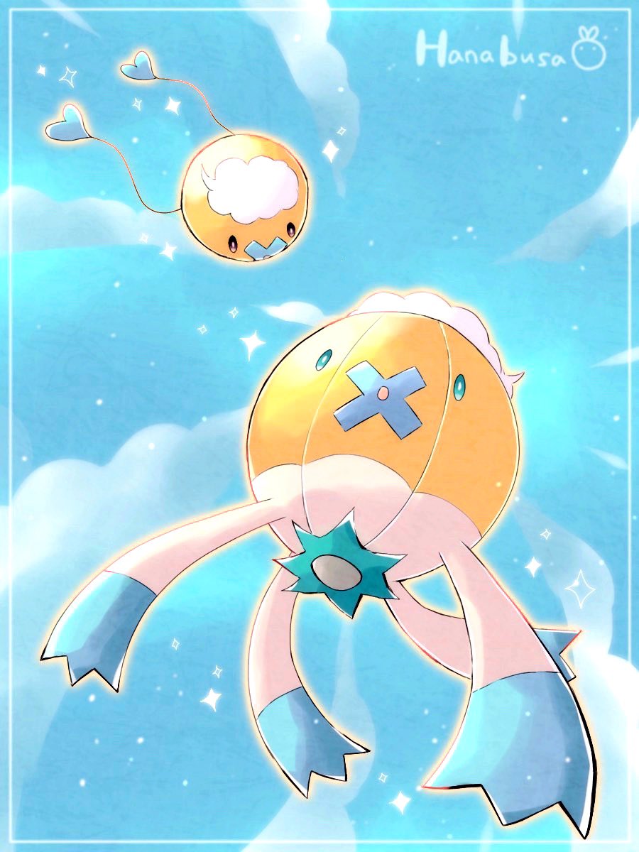 alternate_color animal_focus artist_name balloon blue_eyes blue_sky border cloud colored_skin commentary_request drifblim drifloon evolutionary_line flying from_below gen_4_pokemon hanabusaoekaki highres nintendo no_humans open_mouth pokemon pokemon_(creature) shiny_pokemon sky solid_oval_eyes sparkle white_border yellow_skin
