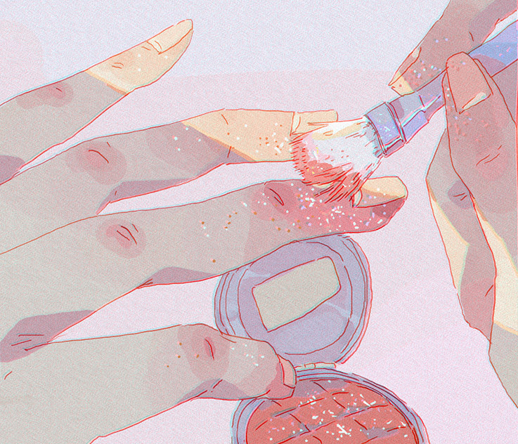 applying_makeup applying_own_makeup chromatic_aberration close-up commentary compact_(cosmetics) cosmetics english_commentary fingernails glitter glitter_makeup grey_background hand_blush hand_focus holding holding_brush makeup makeup_brush original paint_palette pastel_colors purple_background simple_background solo xi_zhang