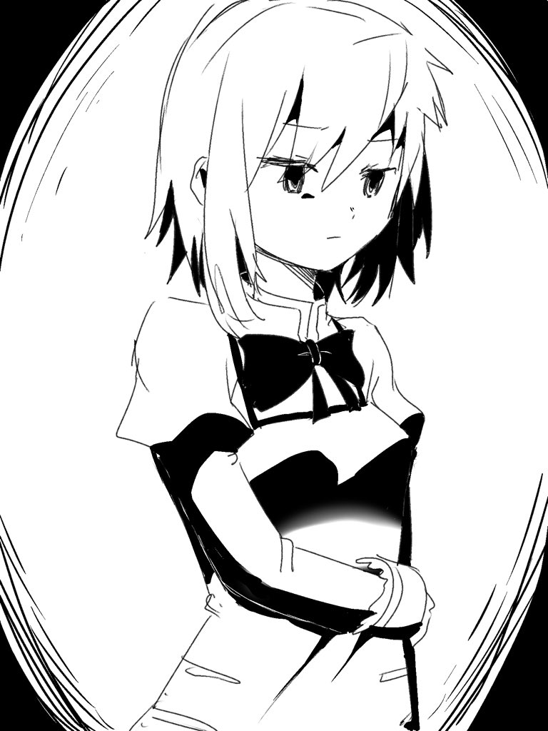 1girl bow bowtie commentary cowboy_shot frl1015 greyscale looking_down mahou_shoujo_madoka_magica mahou_shoujo_madoka_magica_(anime) miki_sayaka mitakihara_school_uniform monochrome puffy_sleeves school_uniform short_hair solo