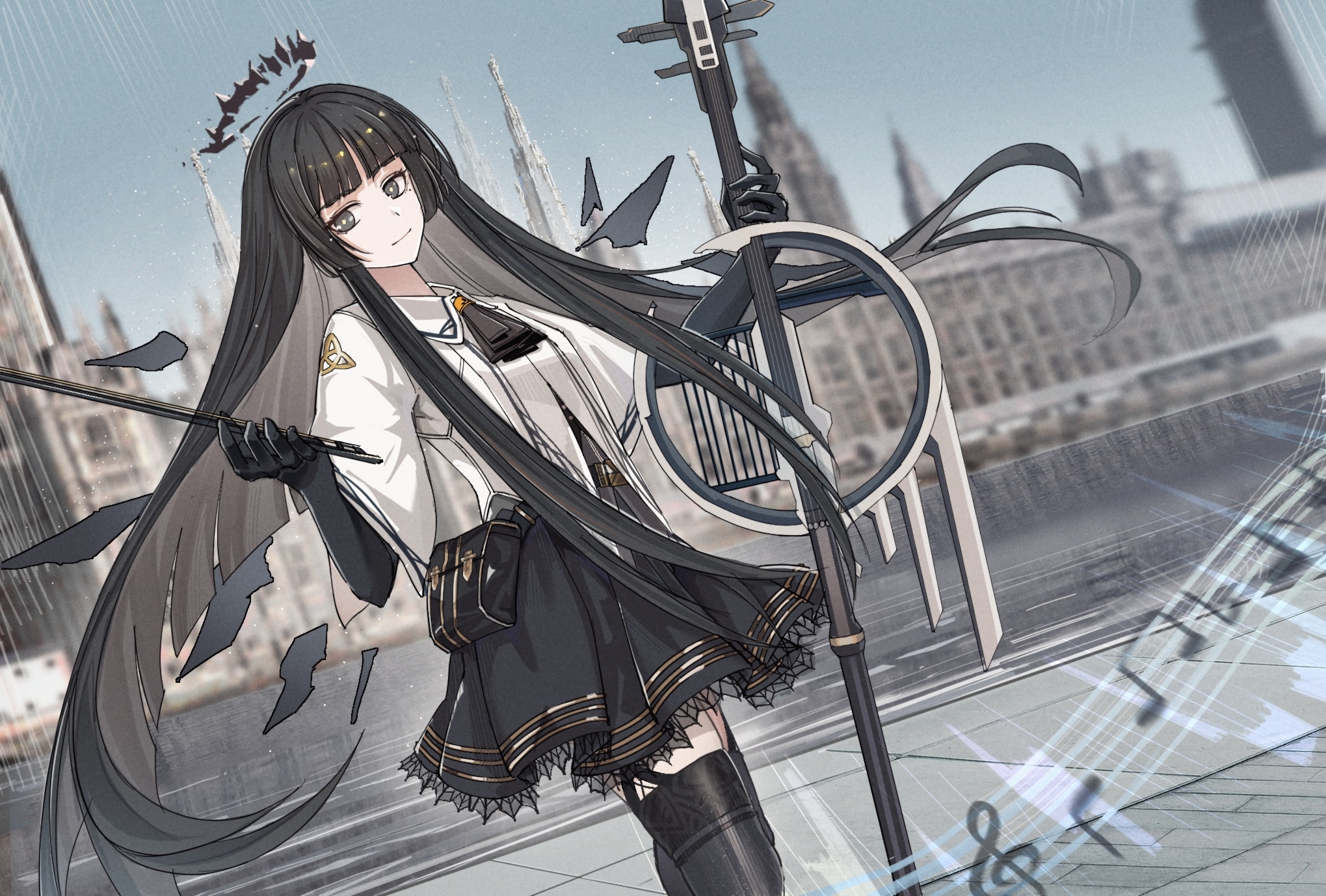 1girl akiclourua architecture arknights ascot belt belt_buckle belt_pouch black_ascot black_belt black_bustier black_garter_straps black_gloves black_hair black_halo black_outline black_skirt black_thighhighs black_wings blue_sky blunt_bangs blurry blurry_background bow_(music) brick brick_road bright_pupils broken_halo buckle building bustier buttons cello chinese_commentary city cityscape clear_sky closed_mouth collared_jacket colored_inner_hair commentary_request cowboy_shot dark_halo day depth_of_field detached_wings diffraction_spikes dress_shirt dutch_angle elbow_gloves energy_wings eyelashes floating_hair from_side garter_straps gloves grey_eyes grey_hair grey_shirt halo hands_up highres hime_cut holding holding_bow_(music) holding_instrument holding_violin instrument jacket layered_sleeves light_particles light_smile long_hair long_sleeves looking_at_viewer looking_to_the_side miniskirt mole mole_under_eye multicolored_hair musical_note musical_staff outdoors outline outstretched_hand pale_skin pleated_skirt pouch reflection reflective_liquid river riverbank road shirt short-sleeved_jacket short_over_long_sleeves short_sleeves sidelocks skirt sky solo standing sunlight thighhighs two-tone_hair very_long_hair violin virtuosa_(arknights) water white_jacket white_pupils wide_sleeves wing_collar wings zettai_ryouiki