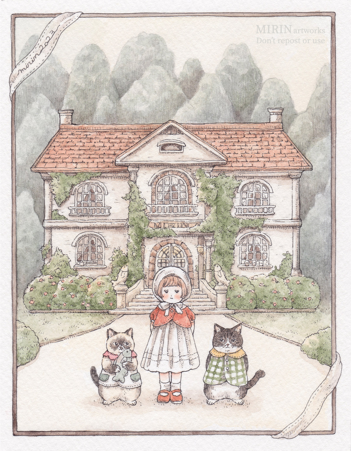 1girl arms_behind_back bonnet brown_hair building bush cat dress highres holding holding_stuffed_toy house mary_janes mirin_(mirin_4) original outdoors painting_(medium) red_footwear shoes stuffed_animal stuffed_fish stuffed_toy traditional_media tree watercolor_(medium) white_dress