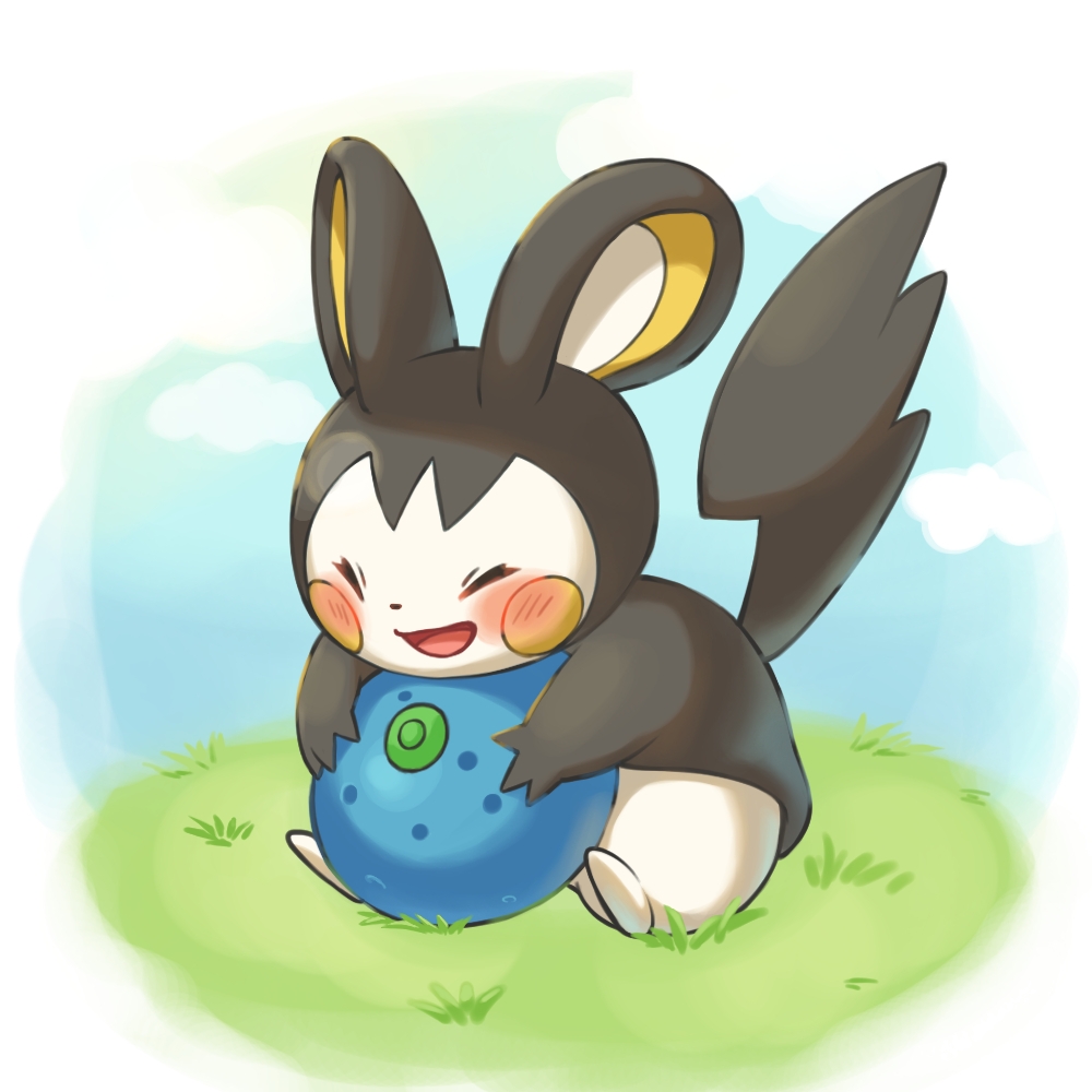 :d berry_(pokemon) blush closed_eyes commentary_request emolga food fruit gen_5_pokemon grass happy holding holding_food holding_fruit nintendo no_humans open_mouth oran_berry pokemon pokemon_(creature) smile solo tominakami tongue