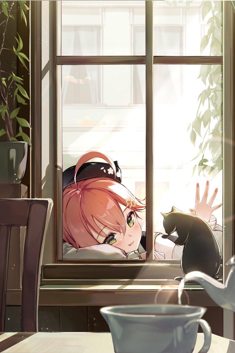 1girl ahoge black_cat black_headwear cat chair cup green_eyes hair_ornament hairclip hololive official_alternate_costume pink_hair plant pouring sakura_miko sakura_miko_(casual) solo syafa table teacup teapot virtual_youtuber window
