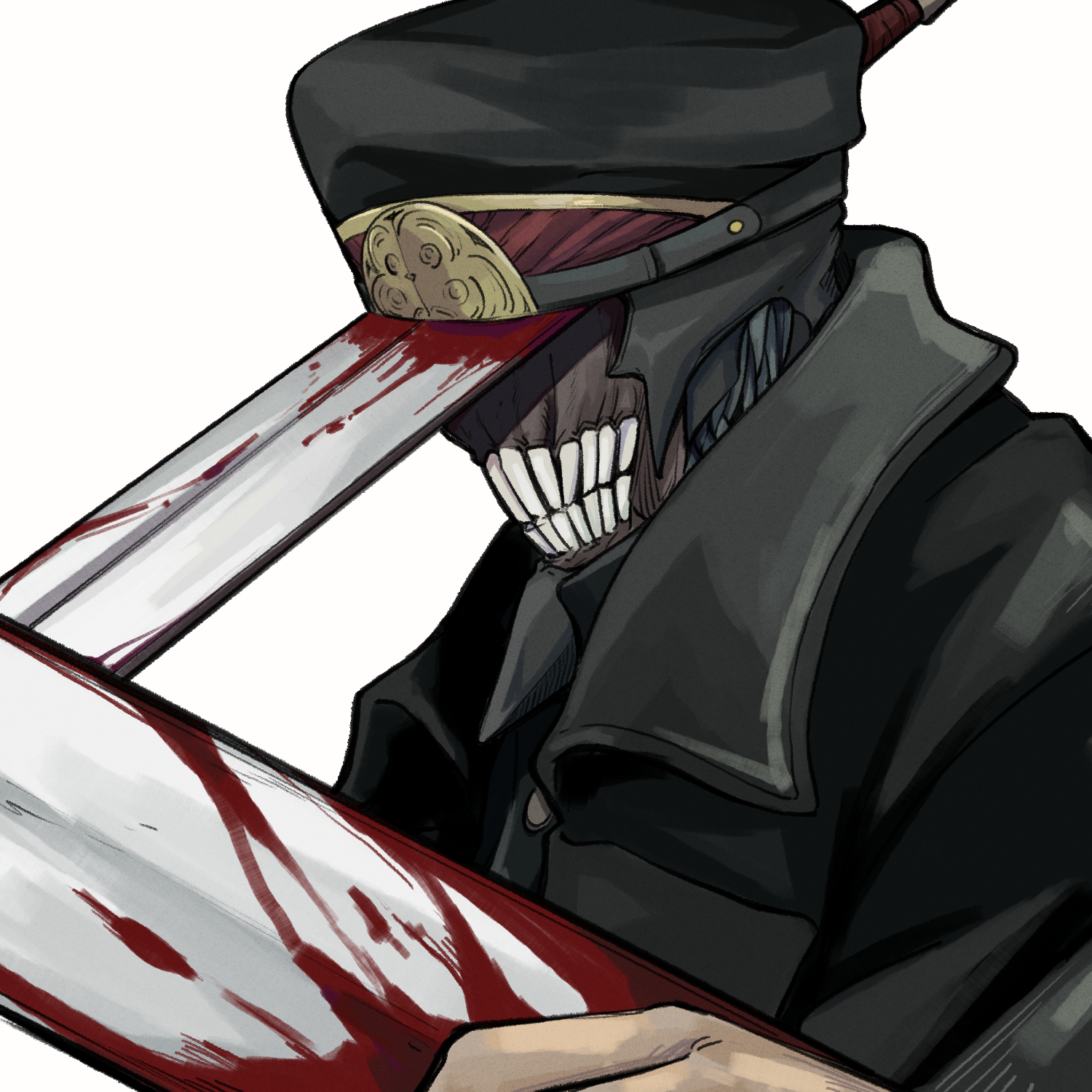 1boy black_coat blood bloody_weapon chainsaw_man coat collared_shirt cropped_torso facing_to_the_side futakuchi-onna hat highres katana katana_man_(chainsaw_man) male_focus military_hat portrait sharp_teeth shirt simple_background solo sword teeth trench_coat upper_body weapon white_background yuma_kahara
