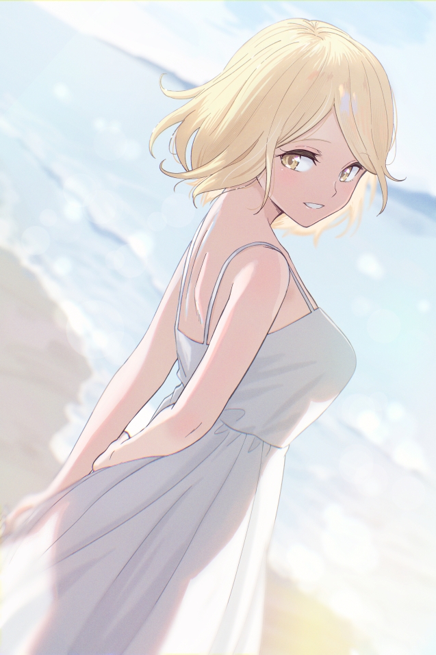 1girl arm_at_side arm_behind_back bare_arms blonde_hair blush borrowed_character breasts commentary_request commission cowboy_shot day dress dutch_angle eyelashes from_side long_dress looking_at_viewer looking_back medium_breasts medium_hair ocean original outdoors parted_bangs parted_lips shibasaki_shouji skeb_commission sleeveless sleeveless_dress smile solo standing sundress white_dress