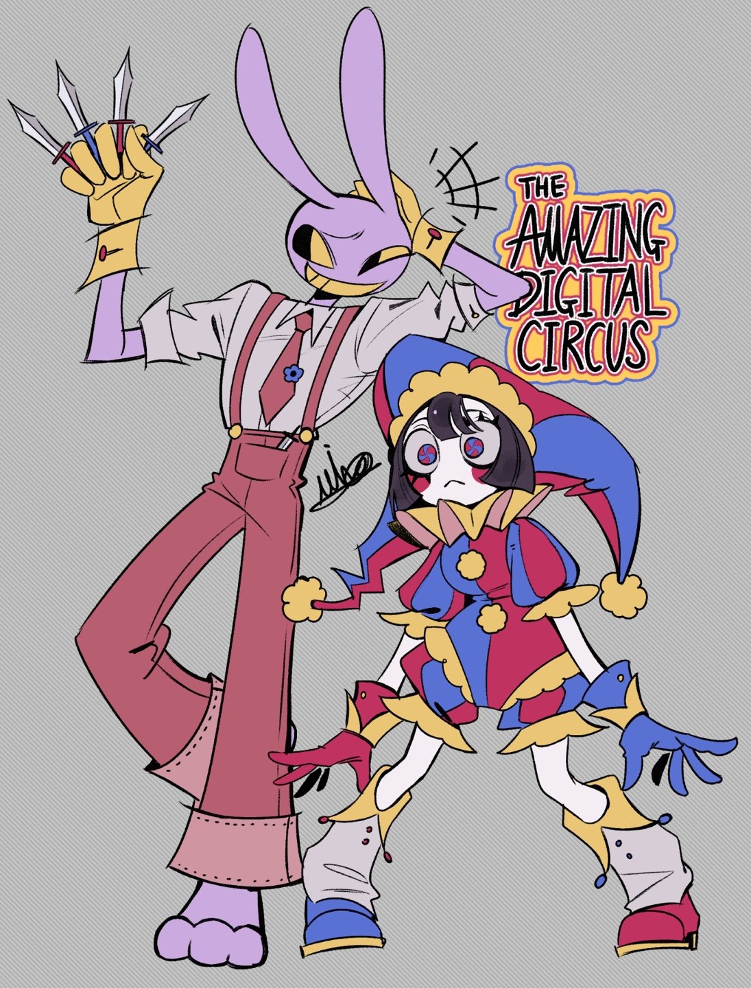 1boy 1girl 3mia_hadi3 adapted_costume animal_ears asymmetrical_gloves blue_eyes blue_gloves blue_headwear blush_stickers brown_hair clenched_teeth colored_sclera colored_teeth full_body gloves hat hat_bell highres jax_(the_amazing_digital_circus) jester jester_cap jester_costume mismatched_gloves multicolored_eyes multicolored_headwear necktie overalls pomni_(the_amazing_digital_circus) rabbit_boy rabbit_ears red_eyes red_gloves red_headwear red_necktie red_overalls smile standing striped_clothes striped_headwear teeth the_amazing_digital_circus two-tone_eyes vertical-striped_bodysuit vertical-striped_clothes vertical-striped_headwear yellow_gloves yellow_sclera yellow_teeth