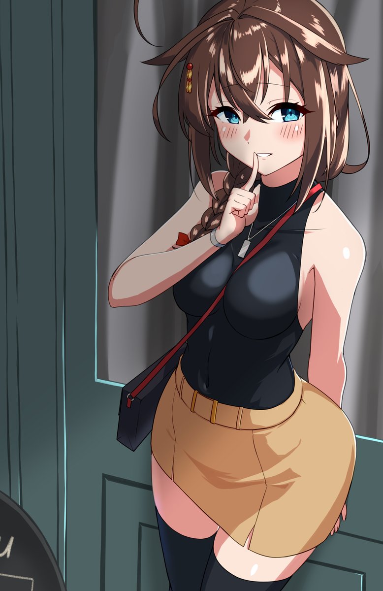 1girl ahoge alternate_costume bag between_breasts black_shirt black_thighhighs blue_eyes braid breasts brown_hair door finger_to_mouth hair_flaps hair_over_shoulder highres jewelry kantai_collection medium_breasts necklace shiba_(zudha) shigure_(kancolle) shigure_kai_san_(kancolle) shirt shoulder_bag single_braid sleeveless sleeveless_shirt solo strap_between_breasts thighhighs turtleneck