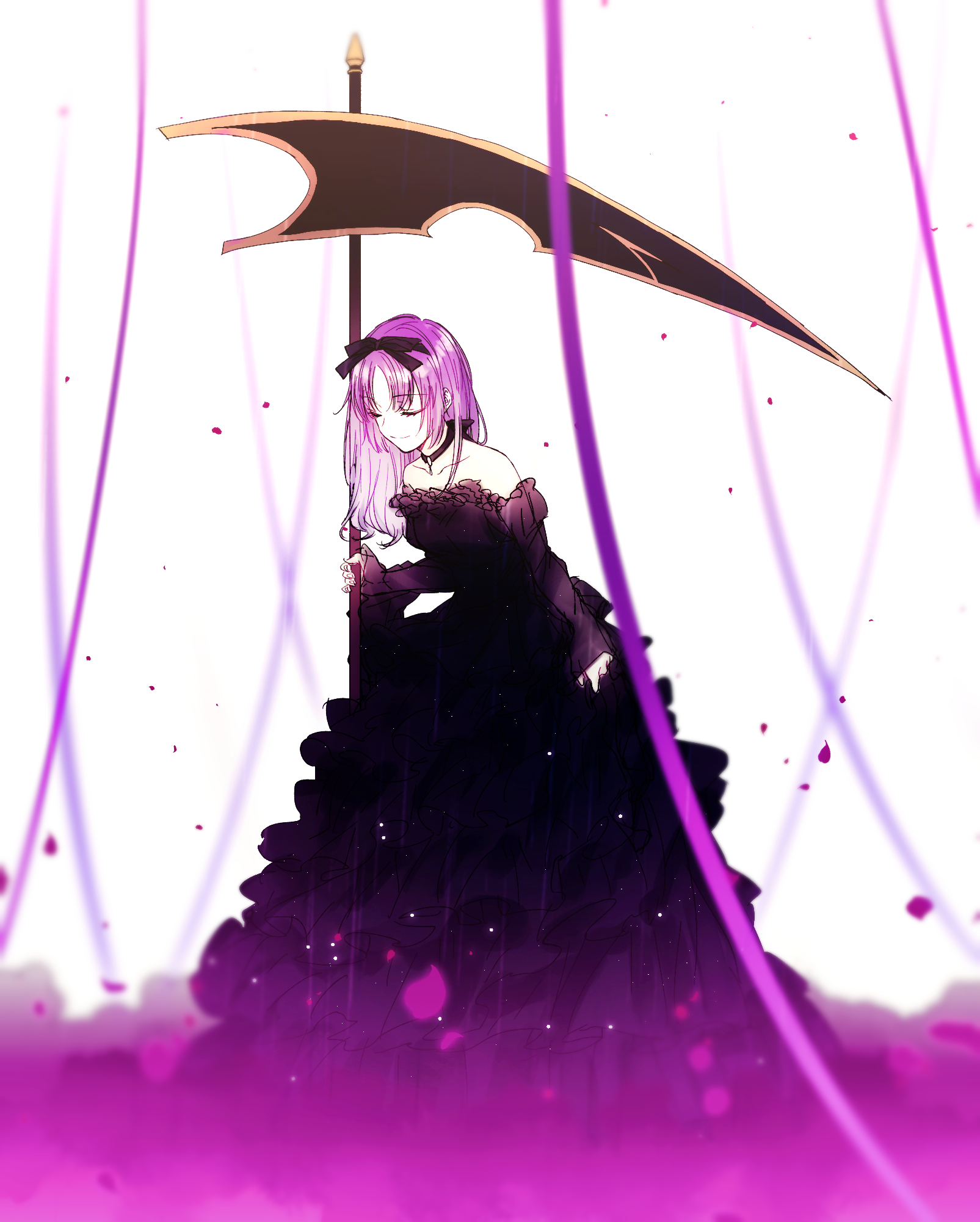 1girl black_choker black_dress black_ribbon choker closed_eyes dress eiyuu_densetsu frilled_dress frills hair_ribbon highres holding holding_scythe huge_weapon medium_hair off-shoulder_dress off_shoulder pink_hair renne_(eiyuu_densetsu) ribbon scythe sen_no_kiseki sen_no_kiseki_(series) sen_no_kiseki_i sen_no_kiseki_iv simple_background smile soap_(user_kghh4755) solo weapon white_background