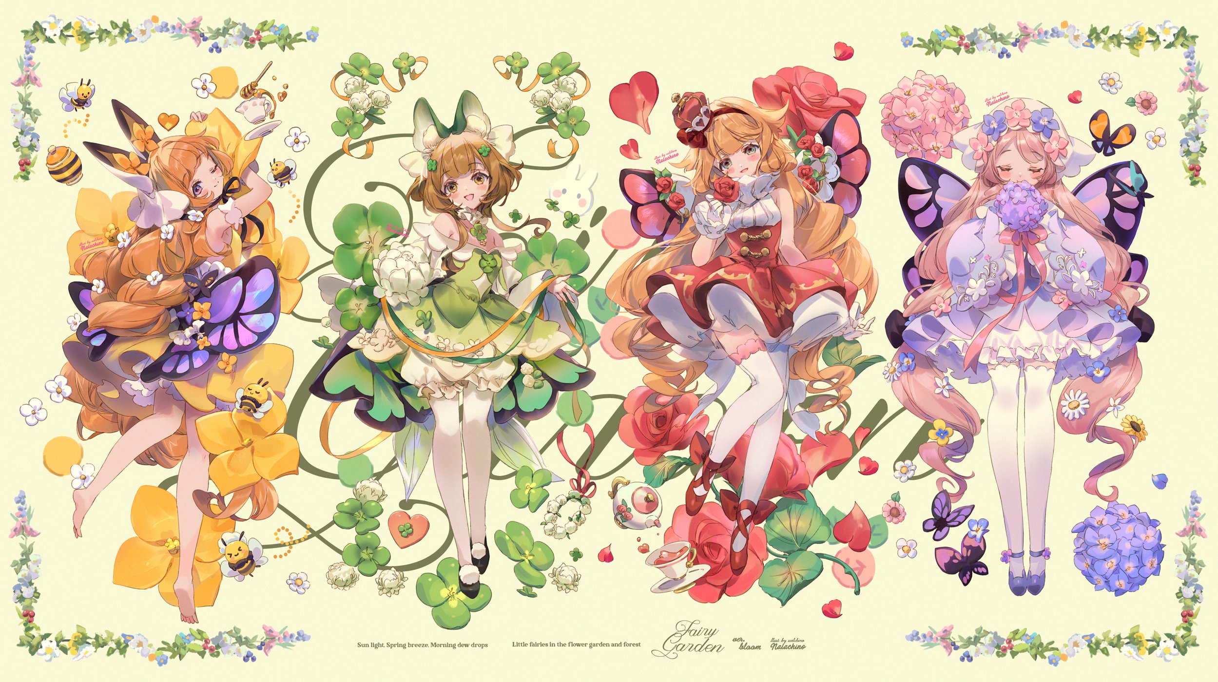 4girls :d ;) animal_ears ankle_bow ankle_lace-up ankle_ribbon ankle_strap aqua_eyes barefoot bee black_bow black_footwear black_ribbon bloomers blue_flower blue_pansy bow brown_hair bug butterfly butterfly_wings choppy_bangs closed_eyes closed_mouth clover clover_(flower) clover_hair_ornament collar commentary crown cup curly_hair daisy_(flower) detached_sleeves dress dress_flower english_commentary english_text facing_viewer flower flower_wreath four-leaf_clover frilled_collar frills full_body gloves green_dress green_ribbon hair_bow hair_flower hair_ornament hairband headscarf high-waist_skirt highres holding holding_flower holding_ribbon honey honey_dipper honeypot hugging_object hydrangea insect insect_wings juliet_sleeves leg_ribbon legs_together light_blush long_sleeves looking_at_viewer looking_back low_twintails low_wings mini_crown multiple_girls neck_ruff nemophila_(flower) off-shoulder_dress off_shoulder one_eye_closed open_mouth orange_butterfly orange_hair orange_ribbon original oversized_flower pansy petticoat pink_butterfly pink_flower pink_hair pink_ribbon pom_pom_(clothes) puffy_sleeves purple_butterfly purple_dress purple_eyes purple_flower purple_footwear red_bow red_flower red_footwear red_hairband red_rose red_skirt ribbon ringlets rose saucer shirt shoes short_hair_with_long_locks short_sleeves sidelocks skirt sleeveless sleeveless_shirt sleeves_past_fingers sleeves_past_wrists smile swept_bangs tea teacup teapot thighhighs twintails underwear veil welchino white_flower white_gloves white_shirt white_thighhighs white_veil wide_sleeves wings wrist_cuffs yellow_background yellow_dress yellow_eyes yellow_flower