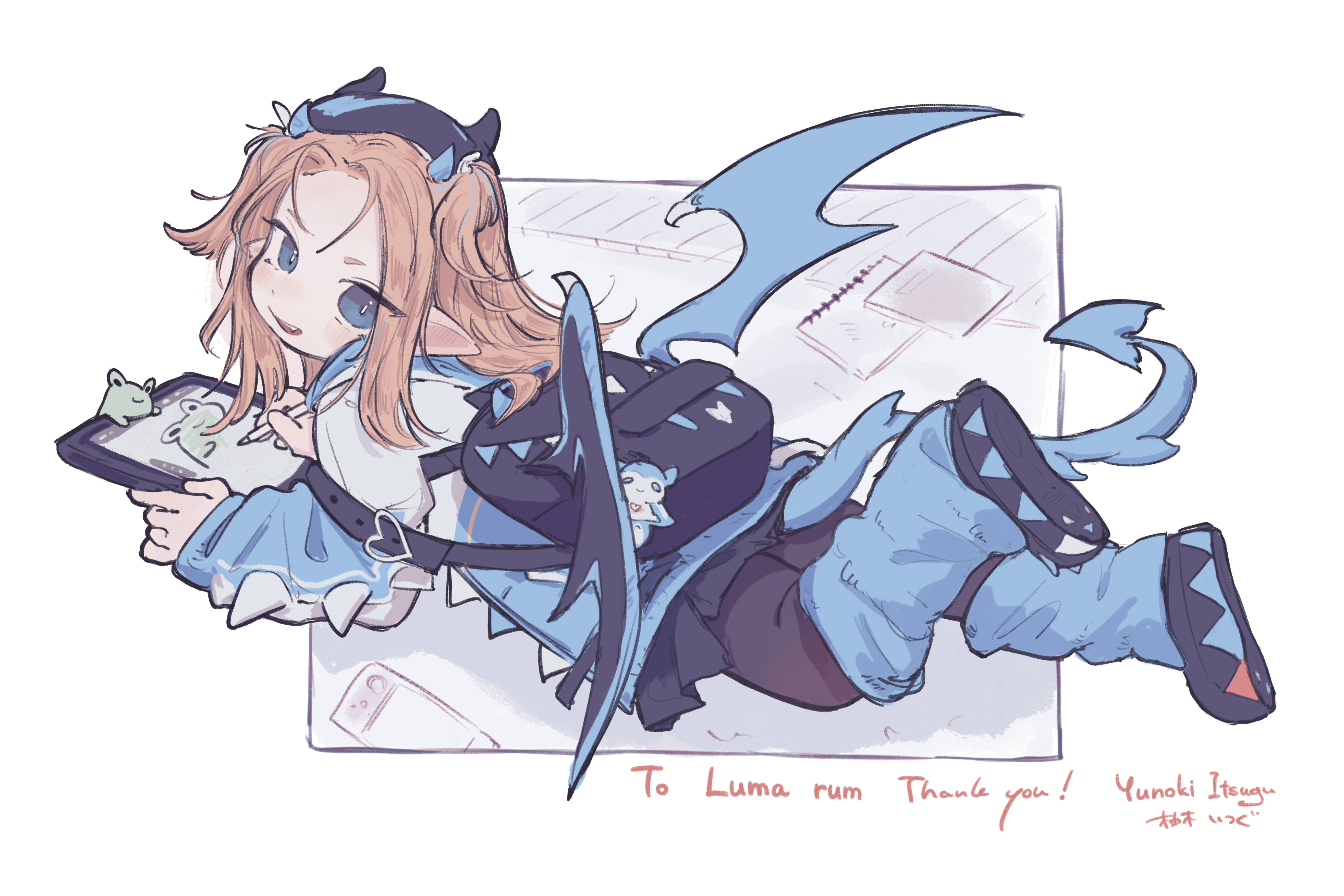 1girl absurdres animal backpack bag bag_charm black_hat black_pantyhose black_skirt blue_eyes blue_tail brown_hair charm_(object) commission drawing_tablet fang frog hat highres holding holding_stylus indie_virtual_youtuber leg_warmers long_sleeves looking_at_viewer luma_rum_(vtuber) lying multicolored_hair on_stomach pantyhose parted_lips pleated_skirt pointy_ears skeb_commission skirt solo stylus tail two_side_up virtual_youtuber winged_bag yunoki_itsugu