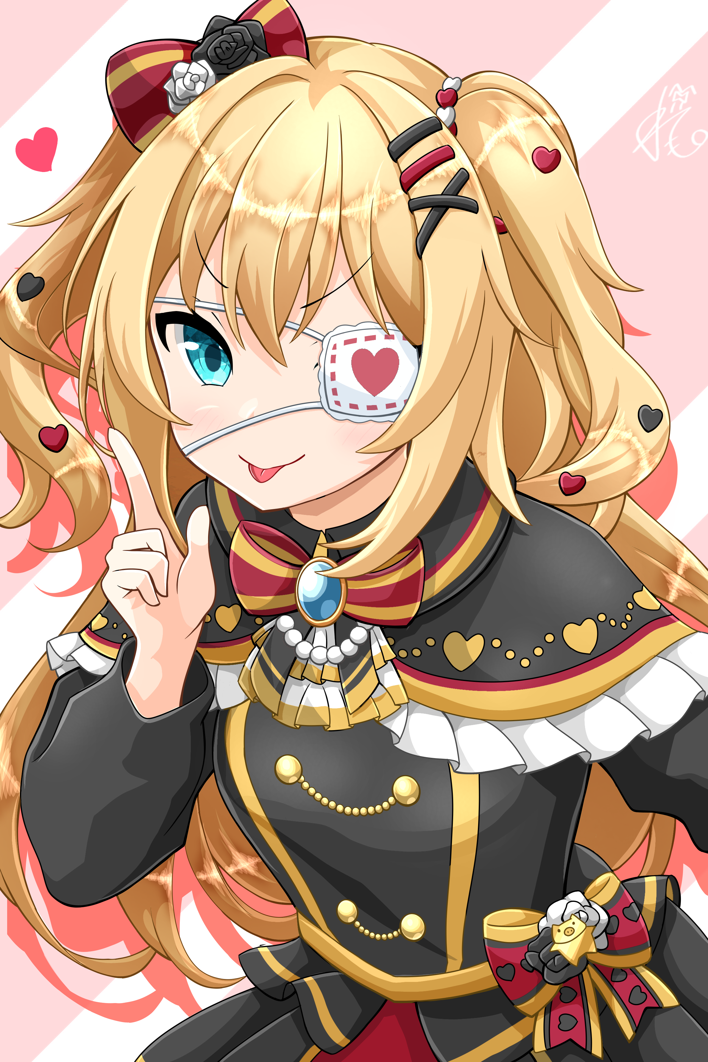 1girl absurdres akai_haato akai_haato_(gothic_lolita) black_dress blonde_hair blue_eyes bow dress eyepatch gothic_lolita hair_bow hair_ornament heart heart_hair_ornament highres hololive lolita_fashion long_hair looking_at_viewer official_alternate_costume red_bow remone smile solo tongue tongue_out two_side_up virtual_youtuber x_hair_ornament