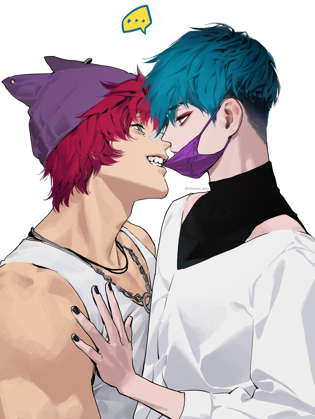 ... 2boys annoyed aphelios bandaid bandaid_on_face bandaid_on_nose black_nails blue_eyes blue_hair chanoo_artz clenched_teeth commentary english_commentary face-to-face fingernails hand_on_another's_chest heartsteel_aphelios heartsteel_sett highres jewelry league_of_legends long_sleeves male_focus mask mouth_mask multiple_boys muscular muscular_male nail_polish necklace official_alternate_hairstyle red_eyes red_hair sett_(league_of_legends) shirt short_hair simple_background sleeveless smile teeth white_background white_shirt yaoi