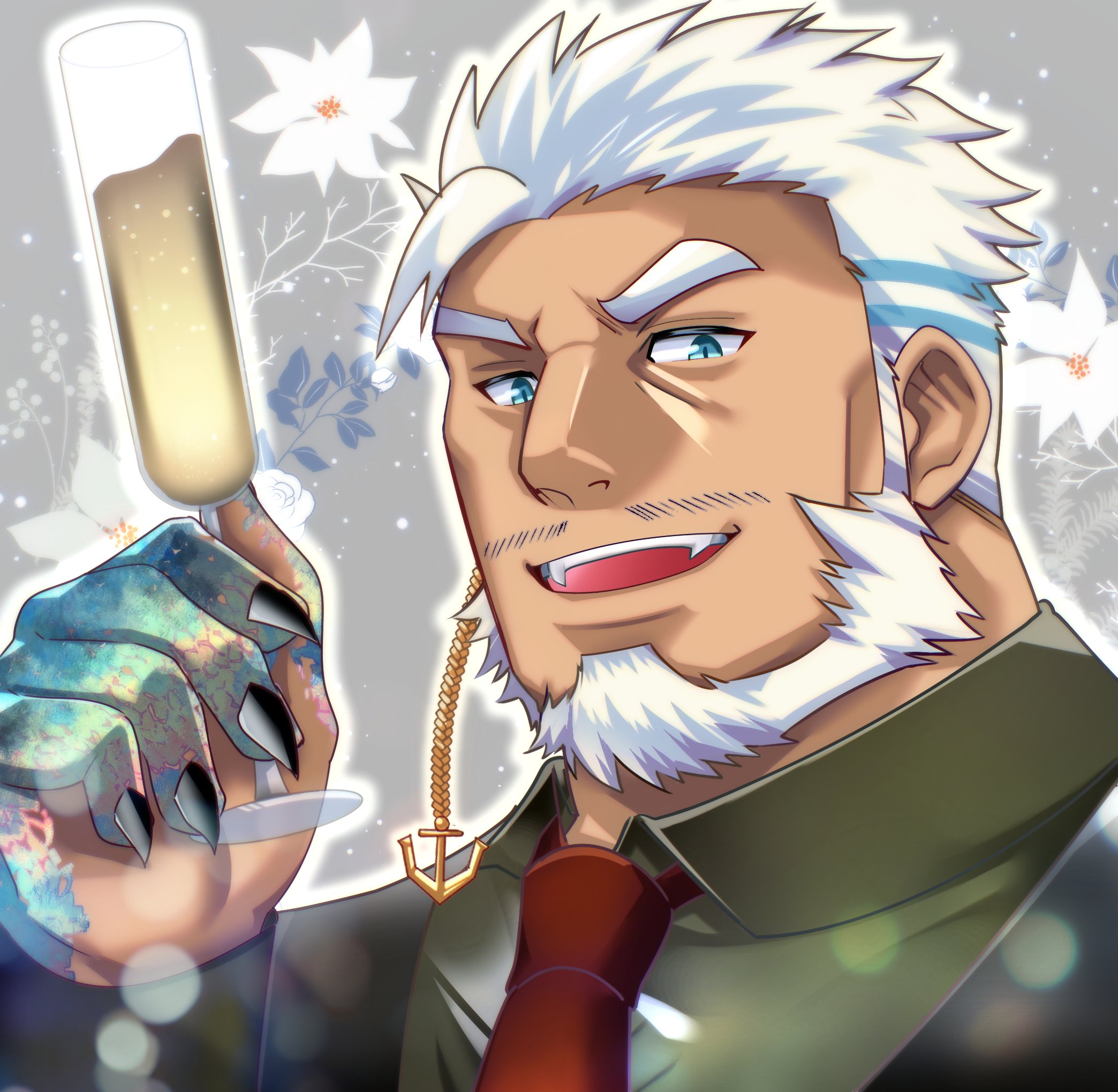 1boy aegir_(housamo) anchor_earrings aqua_hair bara beard blue_eyes champagne_flute cup dark-skinned_male dark_skin drinking_glass earrings facial_hair fingernails highres jewelry male_focus mustache_stubble necktie portrait ramusyutarou scales sharp_fingernails short_hair solo stubble tokyo_houkago_summoners white_hair