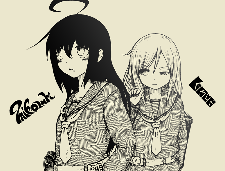 2girls ahoge bag black_serafuku character_name commentary_request crescent crescent_pin greyscale holding holding_bag kantai_collection kikuzuki_(kancolle) mikazuki_(kancolle) monochrome multiple_girls nib_pen_(medium) pen_(medium) raised_eyebrow satou_ikken school_uniform serafuku traditional_media