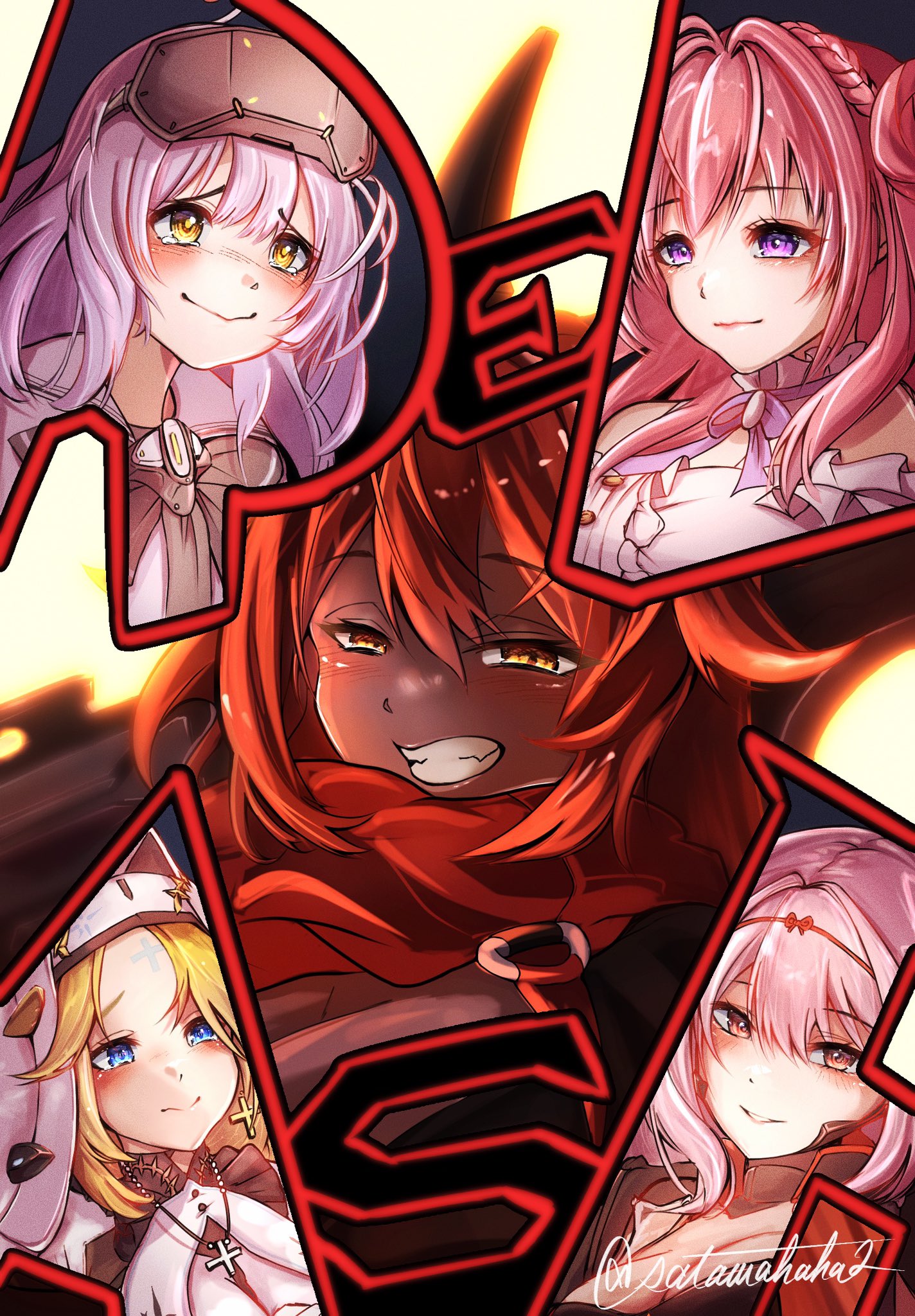 5girls black_bow black_bowtie blonde_hair blue_eyes blush bodysuit bow bowtie braid brown_eyes cloak cross cross_earrings cross_necklace cross_tattoo dorothy_(nikke) dress earrings facial_mark forehead_mark frilled_dress frills goddess_of_victory:_nikke grey_bodysuit grin habit hair_between_eyes hair_bun headgear highres horns jewelry long_hair mechanical_horns multiple_girls necklace nun orange_eyes pink_hair purple_eyes rapunzel_(nikke) red_hair red_hood_(nikke) red_scarf robe sata_(satawahaha) scarf scarlet_(nikke) smile snow_white_(innocent_days)_(nikke) snow_white_(nikke) tattoo veil very_long_hair visor_(armor) white_cloak white_dress white_hair white_robe white_veil yellow_eyes