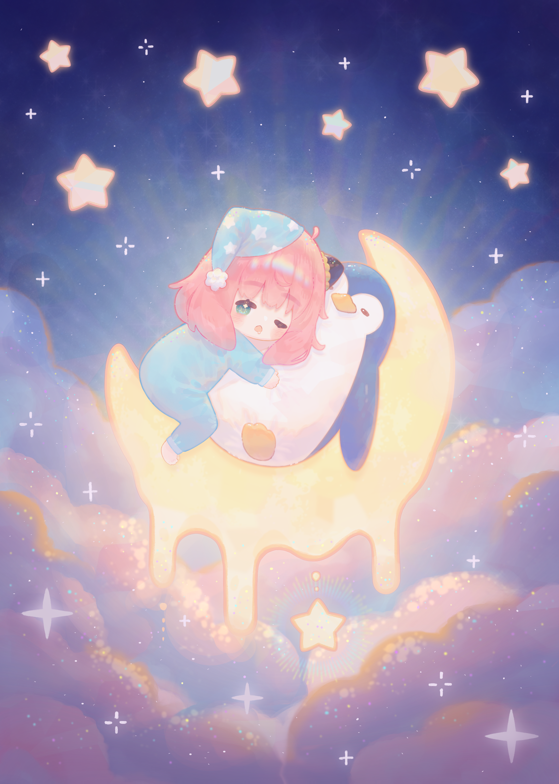 1girl absurdres anya_(spy_x_family) blue_pajamas cloud crescent_moon green_eyes hairpods hat highres jen03426859 medium_hair moon night nightcap one_eye_closed pajamas pink_hair sky sleepwear sleepy solo spy_x_family star_(sky) star_(symbol) star_print stuffed_animal stuffed_penguin stuffed_toy