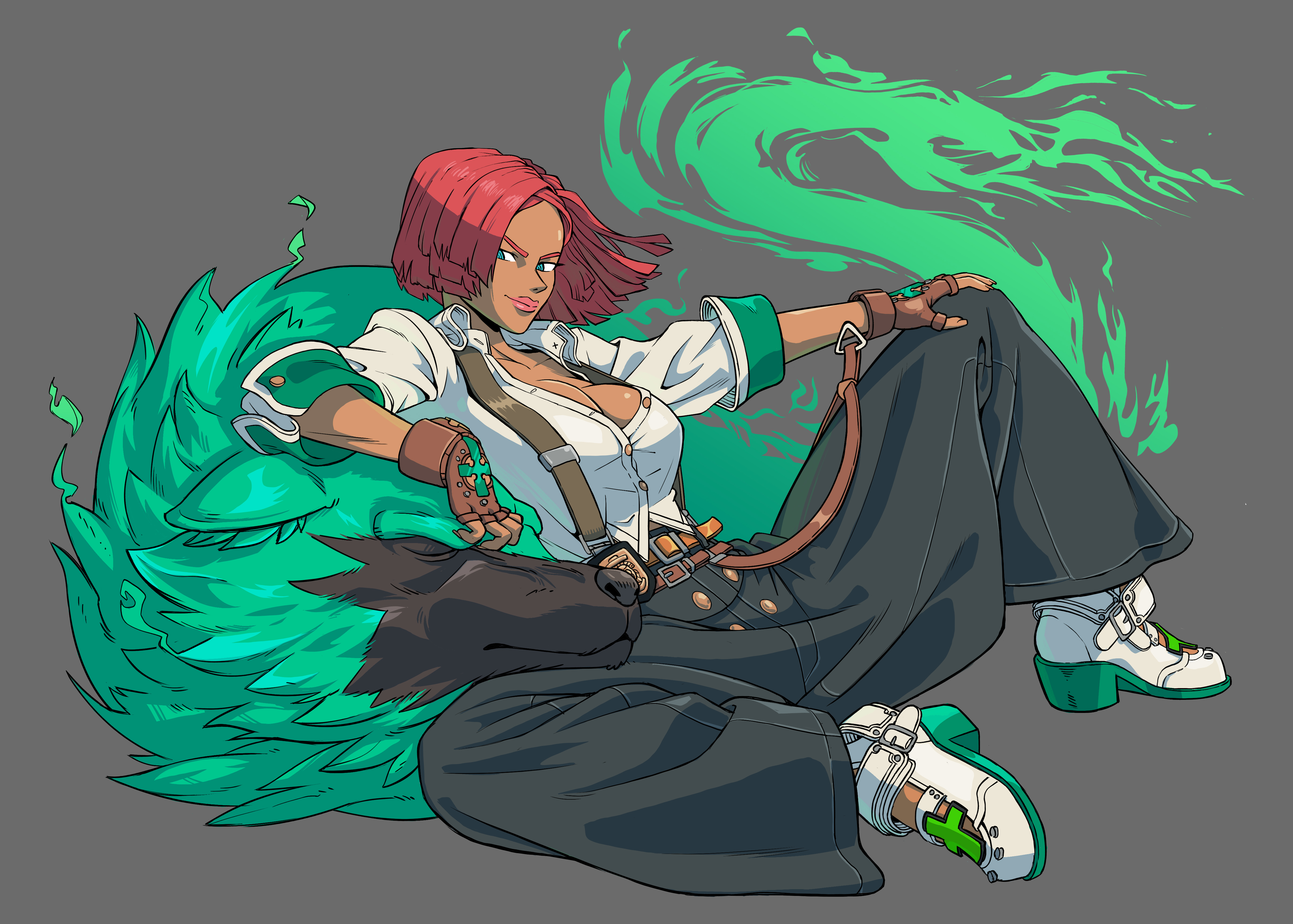 absurdres baggy_pants breasts cleavage dark-skinned_female dark_skin fighting_game fingerless_gloves giovanna_(guilty_gear) gloves guilty_gear guilty_gear_strive highres joecanvas large_breasts non-web_source pants partially_unbuttoned reclining red_hair rei_(guilty_gear) shirt short_hair spirit white_shirt