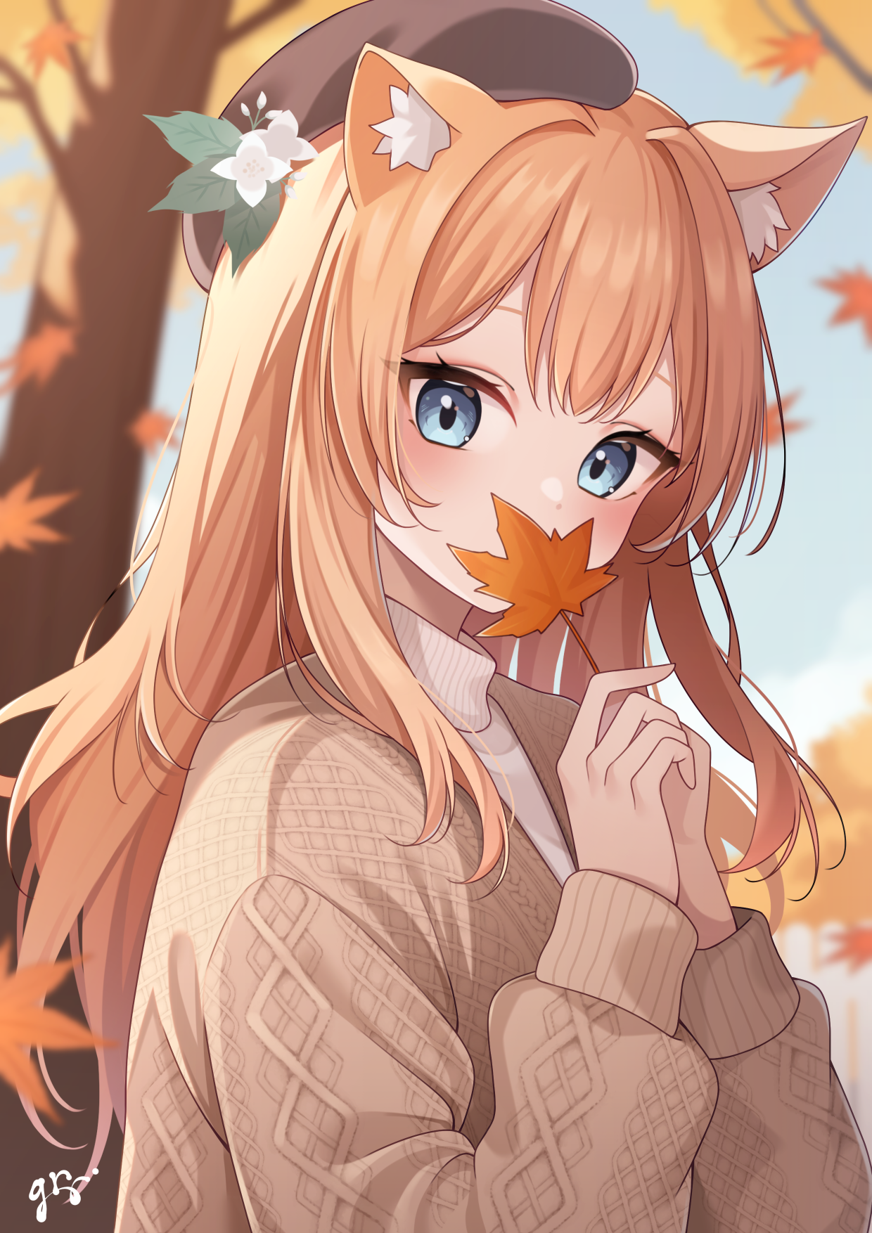 1girl alternate_costume animal_ears autumn autumn_leaves beret blue_archive blue_eyes blush brown_hat brown_jacket flower guri_(gri1211) hair_flower hair_ornament hat highres holding holding_leaf jacket leaf long_hair long_sleeves looking_at_viewer maple_leaf mari_(blue_archive) orange_hair signature solo sweater upper_body white_flower white_sweater