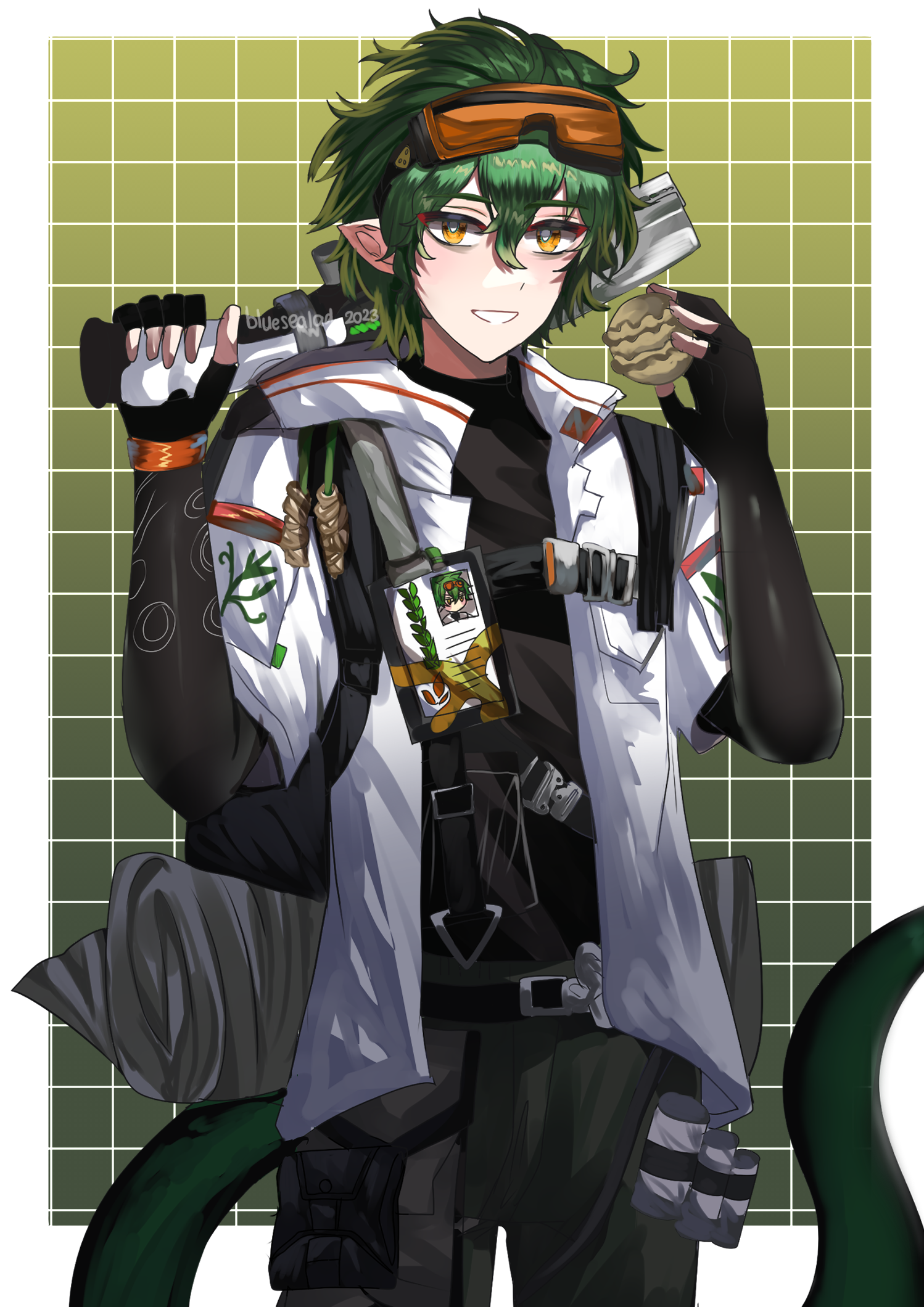 1boy arknights belt fingerless_gloves gloves goggles green_hair highres id_card jacket long_ears orange_eyes pants shorts snake_tail sword tail verdant_(arknights) weapon